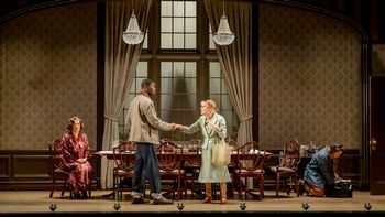 That event has been the source of much speculation regarding what transpired, although it faded as Christie's reputation grew during decades of successful novel writing (63 in all, maybe one more...) and plays. But this odd lacuna has never been put to rest. It seems likely that she was in a deep depression brought about by her mother's recent death and her husband's affair with a young woman. Christie has countless fans who are drawn annually to a festival celebrating her life and creative output. In Armbruster's imaginative script, a depressed Christie fan at this festival a century later, stumbles on something that might solve the mystery. The play opens with a realistic–and amusing–scene in which Agatha (picture-perfect Alex Keiper) enters her book-strewn study screaming hysterically that "Peter is dead." Of course, we leap to the conclusion that this could be the murder to be solved. But it turns out that Peter is her beloved dog who is momentarily missing, as her sardonic friend Charlotte sets her straight. But the 37-year-old writer's hysteria is real and deeply rooted, ramped up again by the unwitting arrival of her arrogant, misogynistic husband, Archie (Matt Bowdren), and his blithe mistress, Nancy (Amira Danan), who Agatha tries to poison. Then a strange time warp has Lucy (Zoë Sophia Garcia), a forlorn bartender from Ohio attending the festival, stumbling into the study talking on her cell phone. The 1926 action has frozen, and it's revealed that Lucy's plight has some curious overlap and resonance with Agatha's. Nosing through papers on the desk she finds pages that might be from a missing novel. Almost immediately, an encounter with William (Blake Hamilton Currie), another desperate fan, reveals that he's onto the same discovery, complicating matters. A starchy elderly guest named Jane (veteran Cincinnati actor Dale Hodges) wanders through and provides Lucy with some startling insights about the pages. Her deductive insights suggest that she is likely Miss Jane Marple, a sharp-minded, eccentric spinster and crime solver from more than a dozen Christie novels and short stories. Subsequent scenes in a dining room and a hotel room–beautifully depicted via Se Hyun Oh's revolving scenic design–slide back and forth across moments of interlocking events in the first act. Lucy's life and Agatha's have some surprising common ground. Following the intermission, Mrs. Christie spins into even more fanciful, dreamlike territory, full of magical realism, but still populated by these characters, some in different but similar incarnations. Adding to the merriment is "Monsieur" (William Studivant), an obvious doppelganger of Christie's master detective, mustachioed Hercule Poirot, injecting self-important but sometimes errant advice. He and Agatha debate how mysteries are solved, and a delightful exchange has them each land separately in a clawfoot bathtub in her hotel room surrounded by surreal imagery. Lucy and Agatha eventually encounter one another across the time warp and compare their mutual plights, discovering how they need to find their own paths back to life by writing the solutions to their circumstances. Armbruster's cleverly paralleled tales interlock perfectly, thanks to director Joanie Schultz's perceptive staging, as the women feel their way out of their predicaments and toward resolution. Neatly reflecting the device often employed by Christie to conclude her mystery stories with all the characters onstage while seemingly inscrutable circumstances are sorted out, the play's conclusion has several amusing moments of starting, rewinding, and restarting until a satisfying finale wraps things up. I suspect Christie's traditional fans could be put off by how this story is told, especially the complex way that time is fluidly handled. Nevertheless, this ingenious script addresses profound issues, especially how women cope with grief and confounding circumstances. While Agatha and Lucy are separated by a century, they show how women can come to terms with seemingly insurmountable challenges and find greater strength within themselves. That happens in this unexpectedly entertaining piece of imaginative storytelling. Armbruster's play was developed over the past decade; it has received a handful of presentations since its debut in 2023. The Playhouse's staging of Mrs. Christie is a co-production with the Milwaukee Repertory Theatre; Joanie Schultz's rendition will move there in April and May with the same cast. (That theater will also present Christie's And Then There Were None in May and June.) Mrs. Christie runs through March 29, 2026, at Cincinnati Playhouse in the Park, 962 Mt. Adams Circle in Eden Park, adjacent to Mt. Adams, Cincinnati OH. For tickets and information, please visit cincyplay.com or call 513-421-3888. |