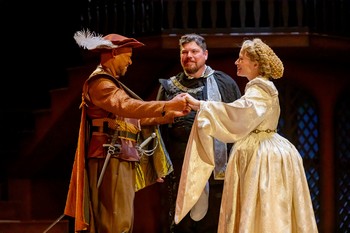 In Shakespeare's time, creating Othello as a Moor–a man of color–identified him as evil. The role was for many years portrayed by an actor wearing blackface, something that is, understandably, no longer acceptable. For Cincinnati Shakespeare Company, director Candice Handy has cast versatile 10-year company veteran Sylvester Little Jr. as Othello. While not played as an imperious military man so often portrayed in productions of the play, Little enlivens him as a man of powerful emotions–love for the beautiful Desdemona (Tess Talbot), fury at military disorder following a brawl instigated by Cassio (Carey Davenport), and aroused to towering, murderous jealousy by the devious Iago (Billy Chace). At one point he is so infuriated by what he is led to believe that he collapses in an epileptic seizure. Handy's production employs an actor, Montez Jenkins Copeland, at the opening of each act wearing an oversized, white clown costume. In her director's note, Handy explains that (in Act II's danced first moments using a familiar aria from the opera Pagliacci, about a tragic clown), he "dons the iconic 'tears of a clown' white face. She suggests that masks in her staging are used "as imagery to represent disguising one's true feelings, identity, intentions and subconscious biases." While this device is subtle, it adds texture to the troublesome elements of racism and deviousness that flow through Othello, from Iago's first mention of "the Moor," dripping with disdain to his condemnation as "this hellish villain." Shakespeare gave the memorable character of Iago, a white man driven by intelligence and deceit, several rationales for his hatred of Othello, an ethnic outsider in Venice: envy at being passed over for promotion by an arrogant military man, as well Othello's abrupt marriage to a beautiful young white woman above his station (her father, Brabantio, played with furious anger by Sara Mackie, is a Venetian senator). But the very foundation of Iago's motives is simple villainy. Actor Billy Chace–best known across his 17 years with Cincy Shakes for comic roles–plays the scoundrel with convincing relish and fiendish sneers. Shakespeare wrote multiple lengthy monologues to explain Iago's desire to ruin Othello; Handy has Chace pacing around and around the entire periphery of the stage, making close, face-to-face contact with audience members seated on all four sides. This makes his fiendish, evil nature all the more immediate and threatening. Not only does Iago warp Othello's perception and mislead other characters, but his cold wickedness can be felt intensively by everyone in attendance, thanks to Chace's performance. The square set for this Othello, designed by Charlie Calvert and lit with moody precision by Andrew Hungerford, has classic Renaissance elements with two immense partial arches at left and right and an overhead balcony with an ornate balustrade. The central platform with a checkerboard floor pattern (quickly converted into an immense bed for the play's tragic conclusion) is overhung by a rectangular cornice and period lamps. All the actors in this production are from Cincy Shakes' core company. In addition to Chace and Little, Tess Talbot embodies the glowing, virtuous Desdemona, attired in a white gown (detailed Renaissance period costumes have been crafted by designer Rainy Edwards). Kelly Mengelkoch delivers a strong portrait of Emilia, Desdemona's faithful maid and Iago's misled wife. She is taken in by her husband's charisma, but her devotion to Desdemona comes through when she recognizes the depth of his deception, which has led Othello to murder his new wife. Carey Davenport plays the virtuous Cassio, promoted over Iago and then victimized when Iago convinces Othello that an affair with Desdemona is happening behind his back. Patrick Earl Phillips is the foolish Roderigo, an asinine and witless suitor of Desdemona whom Iago repeatedly pushes into acts that add to the tale's chaos and cause his own eventual death. Courtney Lucien handles several small roles, most notably, Bianca, a courtesan in love with Cassio, who plays an unwitting part in convincing Othello that Desdemona has been unfaithful. In addition to the fuming Brabantio, Sara Mackie plays several military characters. Grant Niezgodski is the Duke of Venice, who rules that Brabantio has no grounds to challenge his daughter's marriage to Othello: In fact, he chastises the irate father, "Your son-in-law is far more fair than black," an admonition that runs counter to the play's many racist remarks. Handy's thoughtful direction has underscored how easy it is for deception to undermine virtue, even in today's world. In her director's note she stated, "In such unsettling times, when facts are misconstrued and reality is disillusioned, it is difficult to discover truth." Her production and her solid cast are a somber reminder of how easy it is to foment misunderstanding with tragic consequences. Othello runs through March 29, 2026, at Cincinnati Shakespeare Company, 1195 Elm Street, Cincinnati OH. For tickets and information, please visit cincyshakes.com or call 513-381-2273. |