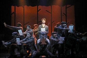 During the first world war, Welsh soldiers struggled to fend off their enemy encroaching from Germany. Scenic designers Christopher and Justin Swader utilize wood, including floor-to-ceiling posts and a variety of crate-like boxes which actors move repeatedly. Guns, too, are wooden. The performers as well as set pieces are oftentimes in motion, with actors positioning them according to various musical numbers and situations. Gomer Jones (Johnny Link) tells his story, which began when, as a boy, he contracted meningitis and he now cannot hear. Nevertheless, he enlists in the army and must convince skeptics that he is not deaf. Marshall Pailet wrote and directed this production while Alexandria Wailes serves as director of artistic sign language for the show, based upon an actual Private Jones. The cast includes hearing, hard-of-hearing, and deaf actors. Myrna Conn provides precise music direction as she plays keyboard and conducts three other instrumentalists. The talented Johnny Link is persuasive as he plays Jones and tells much of the story from his perspective. The actor is hard of hearing and sings exceptionally well, with great clarity. Link combines with David Aron Damane, playing the Father, on the show's initial number, "Snuff Out All the Noise." Damane has appeared in productions of Porgy and Bess, Show Boat, and Tommy, all of which require vocal dexterity. The actor brings deep, operatic tone and presence to all of his roles at the Terris; he also plays the drill sergeant and the major. Within the strong ensemble group, a few actors deserve special mention. Claire Neumann, as King, Leanne Antonio, playing Gwenolyn, and Vincent Kempski, cast as Edmund, shine. One number follows another through the five scenes of this two-act play. It begins in spirited fashion as the company members combine voices on the first three numbers. The production does bog down a bit on "The Western Front" component, which concludes just before intermission. The second act, however, is charged with spirit from the outset as everyone delivers with zest on "Don't Go Talkin' to the Sniper." The subtext for Private Jones does, at a certain point, permeate through music, talk, and dextrous movement (thanks to Misha Shields's choreography). The theme of this presentation revolves around the violence and ensuing death, which are casualties of wartime. Gomer's aspiration was to become a marksman, a soldier who could find and hit a target from quite a distance away. There's often noise filling the theater, but a telling line that one character delivers toward the muted end of the first act says a great deal: "I thought there'd be more noise in the silence." Private Jones, produced in association with Signature Theatre and by special arrangement with HUGO SIX, LLC, is delectably imaginative. Early on, umbrellas snapping indicate birds with wings flapping. Nicholas Mahon has devises one particular puppet which becomes pivotal (no spoiler here). When someone pulls the trigger on a wooden rifle the accompanying sound is not the familiar crack of a gun shot. It is, instead, creative, hands-on noise that accompanies. Johnny Link, seen Off-Broadway, on national tour, and on Apple TV's "Dear Edward," portrays a sensitive if driven Gomer Jones. The actor plays someone whose character arc transforms, and Link's disciplined turn is incisive. The supporting personnel, too, are versatile as they swing from one transformative moment to the next. Marshall Pailet wrote the book, music and lyrics for the show more than three years ago, but its actualization was slowed during the COVID pandemic period. This presentation is complicated, unusual theatre which brings together production elements and thoughtful messaging through music. Without both skilled actors and a splendid creative team, such a high caliber show would not be possible. Private Jones runs through November 5, 2023, at Goodspeed Musicals, Terris Theatre, 33 N Main St., Chester CT. For tickets and information, please call 860-873-8668 or visit Goodspeed.org. |