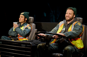 Director Rob Ruggiero maximizes heartfelt, mood-shifting performances by Jeff Brooks and Bebe Nicole Simpson. Brooks plays Danny, a white working class tough-on-the-outside New Yorker who has been collecting garbage for nine years. His personal life is broken and he's hurting, needy–he will ramble on nonstop given the opportunity. To say this guy is rough around the edges seriously understates his look. Simpson's character, Marlowe, is a well-educated woman currently living with her parents in Brooklyn Heights. She went to Columbia University and art history was her concentration. Marlowe insists, as she begins day number one on the route, that she alone can hoist multiple black bags into the truck without any help. She pushes Danny away when he offers to assist. Call it lowbrow humor and throw in irony as well. These two appear to be setting up for a lengthy battle. It is not nearly so simplistic as each harbors a difficult past and the playwright, without pronouncement, carefully weaves in themes surrounding loss and loneliness. Joelle pits these contentious souls against one another within a literal framework, which is quite stunning. Designer Marcelo Martínez García's creative garbage settings jump out at audience members, all of whom are close to the TheaterWorks stage. When the action begins, the odd duo sit upon seats in a bulky Mack garbage truck that faces the audience. Trash surrounds them and the performance space is extended by concrete and brick walls on either side. It's all quite arresting. During the first portion of the play one cannot help but question why Marlowe, with her university degrees, could possibly seek a spot on the sanitation roster. Danny at first mispronounces her name and dubs her "Shakespeare," providing a couple of lines from Hamlet. He talks and talks and talks while tautly wound Marlowe is hellbent on proving she can do the work. Then there's "mongo." That's the word for a precious type of item which might be hidden amongst trash. The two rivals seek to outdo one another and score one of the obliterated jewels. This is just absurd, winning fun. I suppose it's predictable that these individuals will find a deeper meaning and camaraderie between them. As the scripting unveils and the show heads in that direction, it all feels inviting, even if that formula is not a new one. Joelle's dialogue is (except for a very few moments) catchy and earnest. This production evolves as Danny and Marlowe shed exterior layers to disclose humans whose worlds overlap. Brooks and Simpson, as they unmask Danny and Marlowe, demonstrate precise timing. The moment-to-moment acting (continuous for the hour and a half, aside from swift scene interludes) is as affecting as it is impressive. Brooks has credits on a number of nationally touring shows while Simpson was seen on Broadway in Camelot. Director Ruggiero has his actors extremely well synchronized. Playwright Joelle now lives in Tucson, Arizona, while she received her higher education degrees at Columbia and Hunter in New York. It's fair to say that she captures the beat of the urban sanitation scene precisely. Her playbill notes for this show explain that she talked with people collecting garbage from various places in this country–these "essential workers." Joelle is an award-winning writer who fuels The Garbologists with drive, wit and touch. Her characters try, at first, to be stoic. Beneath it all, however, Danny and Marlowe shield delicate, vulnerable souls. The Garbologists runs through February 25, 2024, at TheaterWorks Hartford, 233 Pearl St., Hartford CT. For tickets and information, please call 860-527-7838 or visit twhartford.org. |