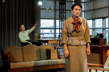 The play is set in the 1950s in Brooklyn's Red Hook neighborhood, which is near to the docks. Alfieri (Patricia Black) narrates and also provides some lawyerly commentary every so often. Eddie (Dominic Fumusa) adores and also protects his niece Catherine (Paten Hughes) who is an orphan. Dominic's steadfast wife Beatrice (Annie Parisse) has more or less raised Catherine and believes that the young woman should be encouraged, at the age of 18, to branch out a bit. Until now, the three-person family unit appears to have been especially tight. Marco (Antonio Magro) and Rodolpho (Mark Junek) are Bea's Italian cousins who are immigrating, illegally, to New York. Eddie is willing to have them stay in his house. While Marco is introverted, Rodolpho is just the opposite. Blond and boldly flamboyant, he fashions himself a jazz singer who dances gracefully with Catherine. Arthur Miller does not hurry exposition, so it takes a while for the evolving story to develop. Late in the first act, the plot escalates as Eddie begins to discern that Rodolpho and Catherine have more than a passing interest in one another. Eddie suspects Rodolpho has an ulterior motive. A View from the Bridge relies upon both Miller's plotting as well as character development to maximize its potential. Miller structured this play, and others within his repertoire, with great detail. Eddie's presence dominates throughout but he is, at first, fatherly, then possessive and, with each successive moment, more visibly enraged. He pushes Catherine hard and grows increasingly suspicious of Rodolfo. Dominic Fumusa, who is convincing and solid, might utilize more of his vocal range to his advantage. Yes, the character is distraught from start to finish, but Fumusa could bolster his already successful portrayal if he increased his crescendo by increments. Gifted Annie Parisse personifies Beatrice perfectly. Someone will surely claim that Miller underwrote the character but I don't believe that is so. Beatrice must struggle to sort out her feelings for both Eddie and Catherine since she loves both, and those two come up against one another. Bea is both loyal and smart. As he has in plays like All My Sons and Death of a Salesman, Miller endows women with acute perception to see reality for what it is. Parisse's Bea is both heartfelt and perspicacious. Catherine is forever juggling feelings: for Eddie, for Rudolpho, and for her future. Coming of age as the show begins, the maturation process is rapidly thrust her way. Paten Hughes finds emotional chords within the genuine and also willful Catherine. Antonio Magro's Marco doesn't get a whole lot of stage time until final moments–and then that changes. Rodolpho is pivotal. Costumer Risa Ando provides him with fittingly appealing outfits and the attractive Rodolpho sings, cooks, and makes dresses. He is complicated and one cannot be certain he is completely trustworthy. Designer You-Shin Chen's interior home decor is sublime and features excellent period sofa, chairs, sewing table, lamps and so forth. Director James Dean Palmer makes great use of the added scenic asset, which is the Boathouse's natural outside balcony. Every so often, minor cast members walk along the area. It is not until the final sequence of the show that the exterior dramatically fuels Miller's explosive, moving conclusion. Alfieri, ultimately, addresses the audience with philosophical closing dialogue. Arthur Miller, a most inspiring dramatist of the twentieth century, writes with enviable depth and dimension. A View from the Bridge runs through March 10, 2024 at Long Wharf Theatre at the Canal Dock Boathouse, 475 Long Wharf Drive, New Haven CT. For tickets and information, please call 203-693-1486 or visit longwharf.org. |