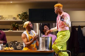 All the performers are Black, and Hall's dialogue acquaints those watching with a particular circumstance of gay, African-American men in Memphis, Tennessee. Everyone's going to help Cordell (Bjorn DuPaty), cooking up a storm, create a chicken wing entry for the Hot Wang Festival. Cordell and his partner Dwayne (Calvin M. Thompson) live in a swanky home. Scenic designer Emmie Finckel's setting is quite gorgeous as it includes a kitchen (stainless steel appliances and nifty backsplash), the kind of living room sofa that encourages snoozing, and a sweet upper-level bedroom. A free standing basketball hoop hovers outside and the characters make use of it. Isom (Israel Erron Ford), sporting colorful hair, and Big Charles (Postell Pringle) are anything and everything but shy and they are free to banter with elevated voices during much of the early going. Cordell is loquacious as well, so each individual in the room fully talks the talk. Ford is also a skilled pianist and all join enthusiastically for song and dance with "Oh, my love" and further lyrics, comprising a definite first act highlight. Although it would be a serious mistake to label it highly plotted, The Hot Wing King includes moments of genuine reflection. Everett (Marcus Gladney Jr.) is Dwayne's nephew who will stay upstairs at the house. TJ (Alphonso Walker Jr.) is Everett's father, not the kindest sort. Everett (also called "EJ") queries Cordell about sexuality, wanting to determine exactly when Cordell realized he he was gay, in an emotive, honest back-and-forth. That softly dramatic scene, just before intermission, rates as the evening's finest. Cordell is sometimes more pensive than one might initially assume. He has left St. Louis, his wife, and his sons, and is moving forward as a middle-aged Black man in a handsome home since coupling with Dwayne. At present, Cordell is driven to win the contest and he is glad to have company as he prepares. Still, during quieter moments, Cordell slows himself down to contemplate where he's been and, even more deeply, what he has lost. Dwayne, who earlier appeared one dimensional, is also multi-sided. Everyone in this ensemble is making their Hartford Stage debut and most of the actors have Broadway and/or Off-Broadway credits. The script not only allows but encourages each to shine. The disciplined cast members impressively adapt to various configurations Christopher D. Betts's direction must be pivotal, because the play includes two genres within its overall context. It's a snappy, clamorous comedy through which ribald and rowdy humor can score points. By turns, however, the presentation is quieter and far more penetrating. The show is never somber but its tone alters to a more moderate key with accompanying restraint. The director helps the actors transition from a vociferous to a more composed manner of delivery. Katori Hall is a gifted writer who has brought to the stage, amongst other plays, The Mountaintop, a fictionalized rendering of Martin Luther King's presence in the Lorraine Motel's room 306 the night before he was slain. Also a fine journalist, the versatile Hall is remarkably penetrating with her dramatic sequences within The Hot Wing King. Screeching, brassy comedy carries through a major portion of the two and one half hour running time of this presentation, but the even more successful lower-key exchanges are heartfelt, revelatory, and certainly enduring. The Hot Wing King runs through March 24, 2004, at Hartford Stage, 50 Church St., Hartford CT. For tickets and information, please call 860-527-5151 or visit www.hartfordstage.org. |