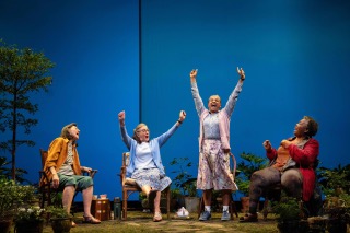 It all begins on a lovely, summer afternoon in England amid a sweet array of houseplants which seem to have been transported outside by Sally (Sandra Shipley), whose garden this is. Vi (Mary Lou Rosato) and Lena (Rita Wolf) have joined their friend for tea. Mrs. Jarrett (LaTonya Borsay) comes along and sits in a fourth chair. They are friendly and happy to speak with one another until a quantum blast literally shakes them and everyone watching the proceedings. It feels as if the house seats are quivering. Congratulations to the following individuals: Lia Tubiana, who created the set; Stephen Strawbridge for blinding, penetrating lighting on either side of the stage; Shawn Lovell-Boyle for mesmerizing projections; and Liam Bellman-Sharpe for music. To call the first of many of these blasts jarring would be to seriously understate. Afterward, there is a return to normal, which means talking about children, grandchildren, other relatives, stores in town, and more. Sally, the hostess, is terribly fearful of cats and this can become obsessive so that, for example, she worries that cats will enter her home at night. This phobia has a grip upon Sally. Lena is anxiety ridden when it comes to getting out and about, so she is, more or less, stuck. Vi murdered her husband in her kitchen (using a knife) and is thus estranged from her son. The three women are pleased to be with one another and most welcoming to Mrs. Jarrett as well. Churchill is a revolutionary playwright (with works such as Top Girls and Cloud 9 to her name), and for Escaped Alone she furnishes multiple shattering explosions of noise, light, sound and, yes, horror. Through visual display impossible to ignore, the audience will experience drowning rains, intense flooding, threatening fires, earthquake aftermath and, really, potential demise of the planet. All the while, Mrs. Jarrett steps forward to deliver monologues while the audience is consumed with the impact of the horrific sensory scene. Call all of this calamitous, apocalyptic, dystopian, excruciatingly negative, torrentially devastating–you choose. It is all part of what Mrs. Jarrett says is rage. Maybe Churchill depicts an inner protected world as delineated by older women sitting about and chatting amid flourishing plants on a beautiful blue-sky day and juxtaposes that scenario with one of unimaginable volcanic-like eruption. Director Liz Diamond is back to work with the diametrically conflicting or incompatible components. Cast members and creative individuals for this show are exemplary. One sequence lends a bit of levity to the short (even if it might not seem so) theatre piece. The entire cast combines to sing, a cappella, Ray Charles's "Hit the Road Jack" and that, my friends, lifts spirits all around. The performers appear to be having a great time with this and why not? It's an opportunity for them to get up, move, and stretch their lungs and legs while displaying versatility. Yale Rep has decided to go full throttle with special effects to accentuate Churchill's prophetic pronouncements that the universe is doomed to destruction. The playwright might be trying to say that, quite literally, some are able to sit comfortably on a back patio while, in reality, darkest days and nights loom for the cosmos. The series of exclamatory, violent multi-dimensional scenes is almost too much–which might be the author's contention, which director Diamond drives home with this production. It's proactive theater for sure and anything but lightly entertaining. Should you attend, fasten a figurative seatbelt around you before this sometimes shattering presentation begins. Escaped Alone runs through March 30, 2024, at Yale Repertory Theatre, 1120 Chapel St., New Haven CT. For tickets and information, please call 203-432-1234 or visit yalerep.org. |