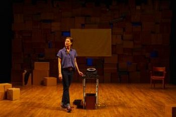 Scenic designer Judy Gallen has piled boxes upon boxes to comprise the background for Lisa as she begins to talk. Upon occasion, she sits in a chair. She activates a carousel slide projector, but only colored squares appear on a screen of sorts. Lisa speaks as if she sees images which beg for her verbal description. She references a trip her family would take each year from Lansing, Michigan, to Cedar Point amusement park in Ohio and also talks of going to Auschwitz with her father. The car ride to that site makes for a brief story in itself. It was there that Lisa's grandparents were thought to have perished as victims of the Holocaust. Her father Walter survived Hitler's purges since he was fortunate, through the Kindertransport, to escape Germany. He did return to that country at a later point to question prisoners of war. Walter, however, would never again see his parents. The play jumps from one recollection to another: Lisa and Walter ride a roller coaster together even if he has taken a pill to ward of a potential heart attack. Besides being physically frail, he is almost blind and Lisa wonders if the coaster adventure will kill him. She adores him and one gathers that Walter was a soulful and giving human being. The scripting effectively gives the audience a sense of this man who had his share of heartbreak during his lifetime. Ultimately, Lisa goes to a crematorium where she had thought she might not have an emotional response. However, she was quite horrified and Kron provides unique descriptive language to fully explicate. The plot also alludes to Lisa's brother's Brooklyn wedding. He met his future wife through AOL and a chat room. Lisa mentions her own lesbianism but this does not become a focus. The production leads one to picture the many vignettes (remember that all you actually see are projected colored squares) and to imagine the rest. It is a show that is both informational and lively. Zöe Golub-Sass directs most adept Lena Kaminsky, who is in motion virtually all of the time. Kaminsky is not extremist in her performance so it isn't surprising that the Hartford Stage rendering of the play never verges on the sentimental. She's impressive when delivering lighter sequences, as she conjures up events of the past. Another director might have gone for greater absolutes when it comes to comedy and tragedy. Golub-Sass and Kaminsky present a more nuanced presentation which might very well leave more for an observer to consider and ponder. The performance feels authentic and honest throughout and fortunately avoids exaggeration. If it is not overly intense and, if anything, somewhat toned down. The writer's narrative and excellent dialogue carry the day. Kaminsky, consistent and highly skilled, facilitates some subtle rather than jarring changes. She has a welcome, friendly demeanor and moves fluently around the stage. She is an inviting performer who is casually dressed in jeans, courtesy of costume designer April Hickman. The script moves here and there often enough without the performer augmenting with over-the-top gesturing or expression. Rather, she wisely delivers through interpretation. Otherwise, one might be watching wrenching, too highly dramatized theatre. Lisa Kron has balanced gentle humor with serious import. Kaminsky, with an assist from Golub-Sass's direction, is seamless as she switches from moment to moment. If anything, the Hartford Stage production is just a bit understated, but favorably so. 2.5 Minute Ride runs through June 23, 2024, at Hartford Stage, 50 Church St., Hartford CT. For tickets and information, please call 860-527-5151 or visit www.hartfordstage.org. |