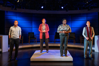 An article St. Germain read informed him that the Minnesota Board of Pardons considered situations for individuals who had already served prison time and now hoped to have their records cleared anew. Each person would explain why he or she believed it was time to move forward without negatives from the past not only haunting them but strongly limiting, for example, employment possibilities. Minnesota's program could encourage hope. Thus, St. Germain, at the top of his script, notes that he was inspired by the Minnesota board and goes on to say "All names in the script are pseudonyms. The procedures and the applicants' stories are adapted from actual cases and rulings." Theatregoers find large laminated cards on their seats which are to be raised after each presentation with either a "pardon" or "deny" to be registered and counted by the actors on stage. Scenic designer Brian Prather situates a number of chairs in a semi-circle on stage. Every so often, one views projected words, such as those of Ghandi, Jane Goodall, and others, behind and above the actors. Actress Peggy Pharr Wilson is first up and she presents Elizabeth James's case. She was convicted for committing arson and now speaks of how she is now a very different human being. Next, Rodney Hicks portrays Donnie Blazer who, imprisoned on assault, admits that he once was drawn to guns but has taken on a parenting role to help a single mother he knows. It's complicated. Joey Collins embodies Martin Johnson, who did time for assaulting a girl who was just fifteen many years ago. He served for a decade but is still not likely to be considered for jobs and, as a musician, is not permitted to travel. Finally, we meet Florence Pullman, who killed someone, a second degree murder crime. Pullman (played by Darlene Hope) is compassionate as she talks about her life now in which she assists some who are in abusive circumstances. That she once took another person's life haunts her to this day. That might have been a perfectly meaningful ending but, instead, there's a final song during which all the actors combine to vocalize: "Forgiveness, forgiveness, tomorrow is a day too late, put down the unforgiving weight, forgiveness, forgiveness..." As mentioned, St. Germain has structured the play so that those in the audience vote after each case. An actor (as board member) dictates both the sentiments of people holding the cards as well as the eventual Minnesota official decision on the person who just appeared. On a recent Sunday afternoon, it became clear that people in the house were more disposed, generally, to giving the presenters another try by clearing their records. The Board deciders were not so willing to forgive. Director Ron Lagomarsino, whose dexterity is necessary, works with these actors who do not over-embellish but persuade through St. Germain's telling, specific, emotive dialogue. Lagomarsino adeptly moves the actors about the stage to actualize the fine scripting throughout. Peggy Pharr Wilson shines time and again when BSC mounts its wintertime 10 X 10 and she is terrific once again here. Rodney Hicks, making his debut at Barrington Stage, is quite persuasive. Joey Collins, with multiple New York credits, has a most challenging task and is successful personifying a man who assaulted an adolescent girl and who now seeks to move on. Darlene Hope mixes feeling with resolve in her character portrayal, too. Forgiveness is a heartfelt, dynamic new play and these performers fully realize its potential. The playwright, as he has demonstrated at Barrington Stage with shows such as Freud's Last Session, Dancing Lessons, Best of Enemies, and Becoming Dr. Ruth, is masterful as he combines reality with imagination through his words. That this play is performed on a stage named for St. Germain is most appropriate. Forgiveness runs through August 25, 2024, at Barrington Stage Company, 36 Linden St., Pittsfield MA. For tickets and information, please call 413-236-8888 or visit barringtonstageco.org. |