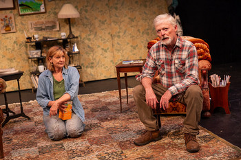 Frangione grew up on Cape Cod and this play features siblings, their accents thick and ringing truly, first situated in a hospital room. This late spring day, working class Tom is visiting his sister, who had an accident after her shopping cart somehow smacked a Subaru. Sheila references "losing her marbles" at a later point and it's clear her plight involves mental rather than physical decline. We hear of Lacey, a sister, but never see her. Shiela's daughter, with whom she has a fraught relationship, lives a few thousand miles away. The main characters reside in a fishing village on the Cape. The first act is filled with anecdotes and stories. Frangione injects comedy, whether it be dark or wry as, for example, Sheila talks about an incident where she "popped a cop." Thomas is ragged and rugged but he genuinely cares about his sister and he does not want to lose her. Set designer Patrick Brennan, during intermission, shifts the scene, a week later, to Sheila's living room, with well-worn furnishings and a couple of throws that cover couch and chair. While the first portion of this play includes a lull or two, the second is tighter and even more intense. Frangione manages, every so often, to write in a moment of levity. Thomas captains a fishing boat and Sheila cares about gardening and small things like monarch butterflies. Their mother was an alcoholic and their father was not around at all. Earlier days have dampened but not fully eradicated possible dreams. Thus, Thomas is determined to prevent Sheila from doing herself physical harm. Frangione is artistic director at Great Barrington Public Theater and his versatility incudes scripting, performing and directing. Judy Braha is now associate artistic director of the Great Barrington Public Theater and she has been involved for a long while in most aspects of live theatre production. Corrina May and Allyn Burrows evidenced knowing rapport and chemistry when, 24 years ago, they starred in Jane Martin's Jack and Jill. It was staged on the grounds of The Mount, Shakespeare & Company's initial locale, in the very intimate Stables Theatre. Suffice to say that all four of these individuals contribute, for the collective good, to actualizing the revelatory, affecting Flight of the Monarch. It is kind of enticing to imagine all of them together blending artistic visions in collaboration for the current rendering. May has performed in more than 30 productions at Shakespeare & Company and many with Berkshire Theatre Group as well. She is particularly adept at finding, sculpting and holding onto her characters. Burrows is the current Shakespeare & Company artistic director who also continues to act. It was just a couple of summers ago that he and Jonathan Epstein so persuasively appeared opposite one another in A Walk in the Woods. The actors neither muff nor miss a moment while catching some that might seem trivial. Frangione's play is not lengthy but it is both penetrating and compassionate. Costume designer Christina Beam appropriately outfits both Sheila and Thomas with clothing that is dirt-stained and has seen better days. On a certain level, Flight of the Monarch can be experienced as quite basic. A younger brother is concerned about his older sister, whose demons might get the best of her. He wants her to stay alive. She disses him but cannot quite dismiss him. Conflicted about whether or not she will hold fast to her own survival, she ardently strives to facilitate the existence of other living things. Who or what continues and is there hope? Flight of the Monarch runs through August 25, 2024, at Shakespeare & Company, Elayne P. Bernstein Theatre, 70 Kemble St., Lenox MA. For tickets and information, please call 413-637-3353 or visit Shakespeare.org. |