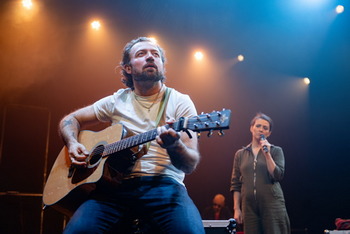 It is called gig theater and, well, what's that? The hybrid form encourages singers to transmit storyline directly to the audience. Russell-Martin, capturing complex, captivating Lana, and McLarnon, embodying guitar-playing Jessie, make a catchy, edgy match. Each has a shining voice and, collectively, they are irresistible. Kyle Falconer composed the songs, which are drawn from his album. He is the primary singer with a Scottish band called The View. Falconer and Laura Wilde are actual life partners. Wilde co-wrote the book for No Love Songs with Johnny McKnight. Goodspeed's published notes indicate the No Love Songs story is a real one. The plot first focuses on Lana, meeting Jessie at a club, sleeping with him, and becoming pregnant. Lana's depiction of her birthing scene, early in the 80-minute presentation, is nothing short of gripping. Sometime thereafter, Jessie goes to America on tour and Lana suffers from postpartum depression even as she attempts to cope by joining a mother's group. She is at best uncomfortable being a mother and at worst in complete despair. She was a college student heading for a career in fashion and now she is unsure whether or not she can parent this child. She and Jessie separate for a time which, while predictable, is nevertheless emotionally jarring to witness. In the end, No Love Songs is more optimistic. The stage is bare except for some speakers and a long electric piano. Gavin Whitworth, who is music director and arranger, accompanies on the keyboard. Every so often McLarnon joins on his guitar; McLarnon's Jessie also goes solo. "Monsters," which Lana and Jessie sing early and later in reprise is most memorable with a line about turning into monsters. Lana wonders if she's in "a Nineties romcom." It might feel to theatregoers as if they are in the midst a contemporary relationship. We are all privy to a snappy set of scenes zeroing in on a bereft young mother and a singer/guitarist on the move. Another perspective says they are individuals seeking to find joy and make sense of their lives and their baby's during a tumultuous time. The actors, so comfortable in performance, are absolutely at home on the stage. Even on a day when they already had a matinee, they were highly energized and always on pitch for the evening follow-up show. It is seamless as the story takes turns being poignant, honest, arresting, and, every so often, just sad. Leila Kalbassi's costuming is completely appropriate. Lana wears a light green jump suit and Jessie jeans and a denim jacket. Each of the actors put on one of Jessie's flannel shirts. Directors Andrew Panton and Tashi Gore, along with musically talented Gavin Whitworth, positively influence the production. Lighting designer Grant Anderson and associate lighting designer Bev Freeman assist with atmospheric mood shifts. In all, it is truly a showcase for high voltage singer/actors McLarnon and Russell-Martin. During duets, they mix harmonies exquisitely. Individually, each is fully capable of nailing higher octave notes with specificity. Both of these actors trained at the Royal Conservatoire of Scotland and each brings significant credits from the stage and television as well. The Terris Theatre, in sweet Chester, Connecticut, is rustic and charming. If this sometimes rousing, sometimes more contemplative performance matches well with somewhat newly defined gig theater, terrific! Really, it's in-between a play and small, live concert and takes on a very natural, easy feel. No Love Songs runs through October 20, 2024, at Goodspeed Musicals, Terris Theatre, 33 N Main St., Chester CT. For tickets and information, please call 860-873-8668 or visit Goodspeed.org. |