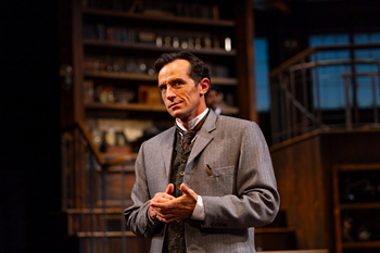 Dr. Henry Jekyll (Nathan Darrow) is a research scientist who experiments with tinctures and powders. Jekyll is responsible for bringing forth different renderings of himself (think alter ego) in Mr. Edward Hyde. Stevenson's fiction dictates a battle between good and evil: Jekyll is a person of reason but Hyde represents a darker persona. Hatcher does not paint the two versions as being diametrically opposite. Darrow's role requires versatility since Jekyll is anything but a linear character. He is complicated man who is beset with anxiety and seems to be constantly in struggle. Peace of mind does not appear to be attainable. Toward the end of the play, he says, "The will is all one needs. Sin is nothing but weakness." Darrow is convincing and his fellow cast members just as persuasive. The plot, which transpires in London during the Victorian epoch (1880s), includes other characters as well. Sir Danvers Carew (Nayib Felix) is a physician who is not to be trusted. Dr. H.K. Lanyon (Peter Stray) and Dr. Gabriel Utterson (Omar Robinson) seem to be decent enough people. Elizabeth Jelkes (Sarah Chalfie) is the love interest and it would reveal too much to expand upon that here. Mr. Poole (Jennifer Rae Bareilles) completes the cast. Scenic designer Sara Brown's set is dark and deep into the performance area. It has an ominous feel. Evan C. Anderson's lighting is somber but shifts and startles to emphasize any one of several, smashing dramatic moments. Costumer An-lin Dauber is of vital importance because her perfect wardrobe choices transport the viewer to nineteenth century England. Jane Shaw delivers the sound and her skill set is vital since this is far from silent theatre. Jeffrey Hatcher skillfully works with fiction and his stage versions, such as one, years ago, for "The Turn of the Screw" and the current Hartford Stage scripting are both exceptionally well delineated. He both honors and augments Stevenson's text. When one reads the Bensussen/Hatcher conversation in the program, it becomes clear that the playwright spent a significant amount of time delving into and contemplating the Robert Louis Stevenson story. Melia Bensussen's proactive approach to the material is evident. She lends her interpretation to Hatcher's work which utilizes the Stevenson as a source. Bensussen injects in-your-face emotion, humor, and struggle by emphasizing detail, and her actors are precise throughout. Choreographer Shura Baryshnikov provides an absolutely necessary element, as the performers need be swift, pliable, and able to execute stops and starts flawlessly. Direction and movement combine to create a most stylized performance. Moreover, the blocking is impactful in order to emphasize some striking sequences. The stage projects toward the audience as if extending a figurative hand to ask for further awareness or cognizance. It's almost Halloween and you or someone you know has heard that Hartford Stage has a scary show on its boards and you're tempted to see it. The good news is that most prospective theatregoers do not need a primer or advanced prepping in order to enjoy the presentation. It is possible to miss something but still enjoy a vigorous and even fun night or afternoon at the theatre. This crackling, less than two hour experience will catch everyone's attention rapidly and hold people (probably on stage and off) constantly captive. Dr. Jekyll and Mr. Hyde runs through November 3, 2024, at Hartford Stage, 50 Church St., Hartford CT. For tickets and information, please call 860-527-5151 or visit www.hartfordstage.org. |