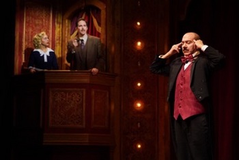 Richard Hannay (Joe Delafield) finds himself accused of murdering a spy named Annabella Schmidt (Sharone Sayegh). She's the one who managed to get into his apartment and drops the phrase "39 steps" even if those in the audience haven't any notion of what that means. Later, as he flees London for the highlands of Scotland, Hannay might be having a romantic fling with a blonde (this is, after all, Hitchcock) named Pamela (Sayegh). Meanwhile, we have Evan Zes playing the memorable Mr. Memory, who appears near the beginning and near the end of this show. Zes is also Clown 2 while performer Seth Andrew Bridges takes on Clown 1, Prof Jordan, and so forth. Zes or Bridges have roles as a newspaper boy, someone selling lingerie, various police people and agents ... it's tough to keep track since one scene flips instantly to the next. Costume designer Jeni Schaefer is a real star since she has outfitted these guys in one snappy getup after another to suit each mini-occasion. James J. Fenton's set is malleable and the actors rapidly tote various properties in and out. All of this occur in the mid-1930s when Hannay, bored to tears, elects to attend an evening of theatre. Fenton's outer scenic design evokes the London Palladium. Those first relatively sedentary moments yield to a frenetic pace as the four individuals on stage barely have time to breathe. The sub-genres of humor include slapstick, farce and vaudeville. Hannay will actually lift a window frame, climb through, and emerge somewhere else. There's also a framed door on stage that is effective for entrance and exit. Mr. Memory, who never wavers when asked to recall something out of trivia archives, is a prototypical vaudevillian type, a man who has the magnificent power to remember most everything and anything. Whether any of this is of value is quite irrelevant. Since this production is derivative of Hitchcock, you might logically wonder: whodunnit? That thought holds for a mere couple of minutes but yields to delightful absurdity, complete with chase and escape within the performance area and, one might imagine, beyond. Keen observers will note reference to Hitchcock through a brief physical outlining of his shape and a nod toward his films such as Vertigo, North by Northwest, and more. Each individual involved with this show gets credit for the pinpoint delivery of The 39 Steps. Joe Delafield's Hannay is a man who shifts from his initial state of ennui to someone more driven and, quickly, a man desperate to get out of town. Sharone Sayegh seamlessly embodies different women (the first with a knife sticking out of her back) while Zes and Bridges, with terrific comic timing, never miss a beat. All of the actors have been on the WCP boards before and each brings a wide compilation of TV and live stage credits. During one sequence, an actor calls out to the audience wondering whether (in Westport, mind you) a doctor might be in the house. What follows quickly is another query asking if, maybe, a stockbroker is watching? Within the context of all the physical shenanigans, that question might have elicited the most boisterous response of all. Adaptor Patrick Barlow provides a splendid script, one which has been utilized in more than 40 countries and led to multiple awards, including Olivier and Tony awards. Barlow is also a screenwriter of note and a man who has appeared in films such as Shakespeare in Love and Notting Hill. His versatile dexterity includes stage and screen performance. He is now writing theatrical versions of "The Hound of the Baskervilles" and "Dracula." Mark Shanahan has acted on and off Broadway as well as at WCP. An adept adaptor himself, he utilizes all of his stage know-how to most effectively activate this smashing show. Even those who are skeptical are likely to find delightfully antic moments within the oftentimes hilarious performance. The 39 Steps runs through November 9, 2024, at Westport Country Playhouse, 25 Powers Ct., Westport CT. For tickets and information, please call 203-227-4177 or visit westportplayhouse.org. |