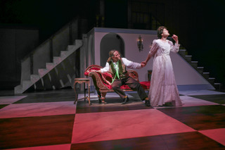 The theatre company works with playwrights, so it is not surprising that this project began two years back when Undeland, inspired by Gerald Elias' short story, "Lacrymosa," first composed a solo piece. Artistic Director Jim Frangione recommended that Undeland expand it to include other characters. It is 1791 in Vienna and Mozart, 35, has just died (Constanze yells "No!" as she literally drags the deceased musician's hidden body all over the stage). His sudden departure leaves his wife and children bereft. Further, he has not completed the Requiem in D Minor. Constanze has gargantuan responsibilities, she discovers, before her. She expresses her reaction to music through response to varied hues of lighting. Lighting designer Matthew E. Adelson's lovely contributions are both lyrical and essential. Men (all played by Winkles, who swiftly changes outfits designed by George W. Veale VI) attempt to control Madame Mozart. The Count von Walsegg (who says he wrote the Requiem) demands money, and Herr Süssmayr physically forces his way with Constanze. All the while, Madame Mozart moves forward while listening to Orfe, at the keyboard, playing her beloved husband's notes. The creative team has chosen to transform the McConnell Theater by seating the audience on three sides of the stage; the close proximity is favorable. Set designer Juliana von Haubrich furnishes a staircase with an upper door and landing as well as various period piece furnishings on stage. George W. Veale VI's wardrobe selections perfectly suit the era. This play, drawn from fiction, no doubt retains some, yet not all, historical truth. Anne Undeland, in her playbill notes, writes, "In this play, I set out to conjure what it feels like in the immediate wake of a beloved person's death. It's a strangely magical time: agonizing, absurd, intensely physical–but it's beautiful too. The molecules seem to shift and sometimes, you see the person, hear them, feel them. It's dreamlike, operatic in its scope and power. No. Not operatic. Requiemic." Each of the two actors must call upon and stretch skills. Tara Franklin, in addition to many appearances outside of New England, succeeded with multiple roles at both the Berkshire Theatre Group and Chester Theatre Company. She trained, decades ago, through Tadashi Suzuki methodology, which is exceptionally demanding. Franklin, coming to GBPT for the first time, musters tremendous attention to detail as she personifies Constanze Mozart, a desperate woman. She does well with this tension-ridden character who is able to relax, at last, at the final curtain. Ryan Winkles has been with Shakespeare & Company since 2006 and in August will appear there in The Taming of the Shrew. He has appeared at the Great Barrington twice previously and now takes on a role which appears to be simultaneously challenging and fun. The actor, on many occasions, disappears behind a door and a second later comes out wearing a hat or a different color vest and so forth. Winkles shifts his vocal register or accent to highlight unique qualities of characters. Successful staging of this script relies upon and receives two adept, specific performances. Judy Braha's versatile and impressive background includes helming the M.F.A. Directing Program at Boston University College of Fine Arts and a continuing attention to arts activism. She is a collaborative force since getting together with Anne Undeland in December, 2022, in bringing Madame Mozart, the Lacrimosa to reality. Making this form of theatre accessible and viable is contingent upon finding and mixing together individuals' singular skills, and Braha's imaginative direction is catalytic in that process. Madame Mozart, the Lacrimosa runs through July 27, 2025, at Great Barrington Public Theater, McConnell Theater, 84 Alford Rd., Great Barrington MA. For tickets and information, please call 413-372-1980 or visit www.greatbarringtonpublictheater.org. |