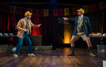 Jeremiah Michael Ginn and John Wascavage are the writer/performers who bring the musical to life and they prove to be pretty hysterical company. Gutenberg! The Musical was originally presented Off-Broadway in 2006 before it had a Broadway run in 2023 with the high-powered Andrew Rannells and Josh Gad. Since it features just two actors, this show turns out to be ideal fare for an intimate theater like the one at Playhouse on Park. Gutenberg! The Musical! won't suit everyone's taste, but, if you are willing to go along with the craziness, it provides definite pleasures. On the small scale set, designed by Arthur Wilson (who is also the able costume designer), the would-be musical theatre writers are Bud Davenport (Jeremiah Michael Ginn) and Doug Simon (John Wascavage), and they address the audience directly, saying that they have spent all the money they had to put on the presentation of Gutenberg! The Musical!. So, essentially, this show is a musical within a musical and, thanks to the masterful comic abilities of the two actors and the canny and finely tuned direction by Sasha Bratt, it does offer a lot of fun. The plot focuses on Johannes Gutenberg inventing the printing press in 1440, but that is just a jumping off point for the two-hour show (with intermission). It is immediately stated that, though there are just two people presenting the musical, the cast is hopefully going to be huge, should it go to Broadway. Instead of costume changes, there are a series of yellow baseball caps with the different characters' names on them and the performers are constantly changing hats as befits the plot of their show. The score by Anthony King and Scott Brown is quite good and the two actors have a grand time putting over the songs. John Wascavage essentially plays Gutenberg throughout, with Jeremiah Michael Ginn portraying his enemy, the "evil" monk. Musical highlights include Wascavage singing the happy "The Press Song" and Ginn countering with the peppy "Stop the Press." The press in question is Gutenberg's printing press, though Gutenberg! The Musical! goes off in so many different directions that the plot becomes essentially about anything and everything. One of the very funny characters in the show is Helvetica, who is illiterate and pines for Gutenberg to notice her. Helvetica's big song is the riotous "(Might As Well) Go to Hell," though all of the numbers are pretty engaging. These include the hilarious duet "Monk With Me" (complete with a big, Wicked-inspired finale) and the inventive "Words, Words, Words," which, thanks to all those baseball caps, somehow becomes a big, full company "chorus line" anthem. There isn't very much of a plot in Gutenberg! The Musical! and that may put off audience members looking for a stronger story. But Sasha Bratt's direction is very good, and there is also expressive lighting design by Kyle Stamm, and Miles Messier is a wizard of a music director and piano player, keeping the show rolling along. What really makes this musical work is the delightful partnership of Ginn and Wascavage, who are very humorous raconteurs and carry the show seemingly effortlessly. The final number is the audience participation song, "We Eat Dreams," and the audience I saw the show with certainly took to it, singing along. Gutenberg! The Musical! at Playhouse on Park is a sort of a mini confectionary of a show and I will confess that it had me smiling from beginning to end. Gutenberg! The Musical! runs through February 8, 2026, at Playhouse on Park, 244 Park Rd, West Hartford CT. For tickets and information, please visit www.playhouseonpark.org. |