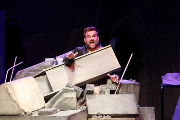 It should be clarified, however, that I Hate Musicals: The Musical is not completely new: most of the songs have melodies from existing Broadway showtunes with new, often hilarious, new lyrics. Running a smooth ninety minutes, without an intermission, I Hate Musicals: The Musical at Ivoryton Playhouse will never be considered an earthshaking new work, but it certainly can be fun to watch. And, speaking of earthshaking, the main plot point of the show actually involves an earthquake. When the musical begins, out-of-work comedy writer Alvin (Stephen Wallem) is desperately trying to pitch a television show idea to Diane (the versatile Amanda Huxtable) in order to get a job. In the midst of this meeting, the earthquake occurs and the show becomes a slightly surreal experience, with Alvin in a kind of purgatory, so to speak, where he is visited by people from his past, both living and dead. This becomes increasingly silly, what with Alvin's parents visiting him from beyond the grave and Jesus and Freud, among others, figuring into the plot, as well. What saves it all from collapsing into a tired show is the good will of everyone involved and, most specifically, Michael L. Reiss' uncanny knack for a funny one-liner or a clever new lyric. The songs spoofed include "YMCA," transformed into "I Hate L.A.," and "I'm Flying" which becomes "I'm Dying." There is a mash-up of "Send in the Clowns" and "The Ladies Who Lunch," in a nod to Stephen Sondheim (though the criticism here that Sondheim can't write good music is extremely stale, by this point in time). Faring better is a take-off on Hamilton, and "I Am What I Am" also pops up toward the end of the show. Garnering the biggest laughs are hilarious parodies of the song "Goldfinger" (complete with projections from the film) and, even better, "Supercalifragilisticexpialidocious," employed with new lyrics detailing Alvin's collapsing mental state. The expert music director and vocal arranger Michael Morris is seen on the side of the stage, playing the piano throughout. The spirited cast also adds to the show's merits. Most of the smaller roles are taken on by Amanda Huxtable, Will Clark, Sam Given, and Ryan Knowles, all of whom do well. Shining even brighter, though, is the ever-reliable R. Bruce Connelly as Alvin's put-upon agent Lee, who is seen vacationing in Hawaii and whom Alvin is repeatedly calling for help. In the starring role of Alvin, Stephen Wallem is an extremely strong singer and he deserves kudos for performing most of the show with rubble piled on top of him. (The wonderfully detailed set is designed by Daniel Nischan.) Wallem has star quality and he serves as the shining center of the show, in which all of the craziness swirls around him. Director James Valletti manages to keep the show moving at a pretty good pace, though even he can't save an over-extended bit about Alvin not going to heaven because he once ate meat on a Friday. Lighting designer Marcus Abbott and the busy costume/wig designer Elizabeth Cipollina both do good work. Most of I Hate Musicals: The Musical is pretty enjoyable and the show is basically silly fun. Whenever things threaten to go off track, there is a clever Michael L. Reiss joke thrown in that sets everything back in place again. The ultimate future of the musical is in doubt, but this premiere production at Ivoryton Playhouse should please the casual theatregoer. I Hate Musicals: The Musical continues performances at Ivoryton Playhouse in Ivoryton, CT through October 15, 2017. For tickets, please visit www.ivorytonplayhouse.org or call the box office at 860-767-7318. |
