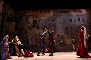 Before a word is spoken, in silhouette and hues of black and white, the actors walk about behind a scrim. They proceed slowly, and sounds of a drum distinctly mark their movements. It brings to mind the slow-walk technique utilized by the Japanese theater innovator Tadashi Suzuki. This opening is all Lamos's. The imagery is transportive and clearly sets the mood for the productiondoom is impending. After the see-through curtain lifts, we see a three-sided mural, designed by the award winning Michael Yeargan, which depicts life in what one assumes is Verona. As ever, the story begins with the feud in Verona between the Capulets and Montagues. Romeo (James Cusati-Moyer) is going to a masked ball where he sees Juliet (Nicole Rodenburg). Tybalt (Dave Register), a Capulet, discovers that the disguised Romeo is a Montague. Juliet by now has completely fallen for Romeo. During the imminent balcony scene, she admits she is in love, but director Lamos presents her as a relatively subdued Juliet. Costumer Fabian Fidel Aguilar has Juliet outfitted in a long, formless dress which covers her from neck to foot. Romeo and Juliet decide they will marry and do so with the assistance of Romeo's friend Friar Laurence (Peter Francis James). The second portion of this presentation begins, again, with a briefer behind-the-scrim moment before yielding to sword fighting. Romeo's best friends are Benvolio (Tyler Fauntleroy) and Mercutio (Patrick Andrews). Tybalt sees Romeo and wants to get into a fight. He duels with Mercurio and kills him. Incensed, Romeo slays Tybalt after these two wrestle. Michael Rossmy is fight director for the scene and the actors are disciplined, skilled, and their movements are precisely choreographed. Midway through the second and longer component of the production, Romeo and Juliet again appear on the balcony. This time, Juliet wears semi-transparent nightgown-like garb. The two young people are now erotic and physical, even if they mostly hug. Should they be star-crossed, Romeo and Juliet feel destined to be with one another forever. As one who still admires Mark Lamos's 1995 production of Romeo and Juliet at Hartford Stage (starring Robert Petkoff and Calista Flockhart), it was impossible for me not to anticipate and also wonder what he would now render. Yeargan designed then as he does now; he and Lamos have worked together on many a show. The WCP depiction is, at times, minimalist and markedly lacking lush settings, different from my memory of the Hartford Stage show. Lamos has chosen two lead actors who seem to be the age of college undergraduates (even if they are probably, in actuality, a few years older). They are not ornately dressed and, if anything, seem to be "normal" rather than wildly alluring or sexy. All of this meshes well with the director's vision. Romeo and Juliet on the playhouse stage is a group triumph. The flashing of swords, by Andrews, Register, and Cusati-Moyer, is, for sure, a memorable highlight. Rodenburg and Cusati-Moyer play Juliet and Romeo as youthful individuals with strengths and weaknesses. Their performances are admirably detailed and carefully drawn. Lamos, once a fine actor and now a highly perceptive director, creates with insight and care. Romeo and Juliet continues at Westport Country Playhouse in Westport, Connecticut through November 19th, 2017. For tickets, call (203) 227-4177 or visit www.WestportPlayhouse.org. |