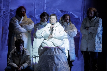 The contingent, from Austin, Texas, provides Dostoevsky characters: Fyodor (Lowell Bartholomee) is large, round, and loud-mouthed. Fyodor is something of a blowhard, a man who has married twice and is far from shy with his opinions. As a dad, he is not particularly kind to his offspring. All of the sons, it seems, would be pleased if he were no longer alive. Ivan (Thomas Graves) is one of his sons, a bearded, lanky man who professes to write poetry but is actually more of a philosopher. One of the less favorable sequences of the evening finds him reading from his own poem entitled "The Grand Inquisitor." Dmitri (Lana Lesley) is the eldest son and he spends much of his time speaking of his love for Grushenka (Hannah Kenah). Grushenka likes men. Alyosha (Mari Akita) is graceful, likable, and drawn to religion. She dances exquisitely. Smerdyakov (Robert S. Fisher) has little impact upon the goings-on. He is an illegitimate son of Fyodor. The company of Rude Mechs work together to craft a unique show. Hannah Kenah (credited with text writing) effectively plays Grigory, Katya, and Grushenka. As Katya, she opens the performance with stand-up remarks, humor and advisories as she appears down stage with a microphone. Yale Rep commissioned this piece and the troupe members collaborate in development. It has taken three years. Shawn Sides directs Field Guide which is mind-expanding, experimental and sometimes surreal. For example, each actor enters the stage from the same side theater door wearing white, puffy winter coats. A couple of times, later on, a great big comic bear joins the proceedings. The bear gets to wield a mike and says, "We were raised to argue." The costuming, by Sarah Woodham, is a huge asset as is music provided by Graham Reynolds. Robert S. Fisher's sound delivery, too, is pivotal. Eric Dyer's set might appear to be simple but it is quite appropriate. Dyer includes geometric pieces which are designed to move about. You might wonder whether it is essential to have mastery over the 975 page novel beforehand. No, but it helps, perhaps, to have a basic sense of the characters. The production bids that a theatergoer enter with an open mind. The show is, to wildly understate, innovative. It demands that actors be physical since this is far from a words-only production. While it includes surprising if not startling choices, nothing is haphazard. For Field Guide, method fuses with imagination. Rude Mechs was formed in 1996 and the result is 30 works. The creative team and acting ensemble include seasoned individuals. They are not adapting Dostoevsky. The Russian author wrote his massive book when he was older and it delves into the existence of God and much more. It isn't possible or wise to attempt to replicate all. Instead, the play dips into the novel and extracts people and circumstances. The artistic journey leads to further exploration. Without spoiling artistic revelation, suffice to say that the final scenes of Field Guide shift into a peaceful and then lighter, more optimistic direction. This spin leans toward hope for more meaningful existence. Field Guide, through February 17, 2018, at Yale Repertory Theatre in New Haven, Connecticut. For tickets, call (203) 432-1234 or visit yalerep.org. |
