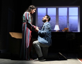 Evan Yionoulis directs a talented acting ensemble. It seems that they have discovered, through the internet, a script, one of high melodrama. For 30 minutes or so, situation comedy carries the show. Ahmed (Ian Lassiter) is determined to wed Hadeel (Sohina Sidhu). Youssif (James Cusati-Moyer) is, however, completely smitten with the young, attractive Hadeel. She admits, in a burst of language, that she is ready to sleep with him. Youssif's current girlfriend is Bana (Hend Ayoub). This is all set within the context of a living room in Damascus, 2014. Hadeel is actually facilitating an evening to watch a soap opera on an old television. The first third of Kiss, featuring more than a few declarations of love, is laugh-out-loud stuff. There is a brief break and the cast reappears to explain that we will now be introduced to the scriptwriter. A Skype-type video features a tension-ridden Woman (Rasha Zamamiri) who wears a blonde wig and dark sunglasses. Appearing on a rear screen with her Interpreter (Abubakr Ali), she absolutely shifts the tone of the production. This is a tough time and Syria is a country beset with war and subsequent loss of human life. That portion of the presentation profoundly transforms atmosphere and theme. Next, the actors revisit their original script but so much has changed. They felt they did not get it right the first time. Hence, try again. Hadeel is coughing repeatedly as are some others. Intensity and the promise of suffering have replaced levity. Multiple interpretations are possible; this is not a play which neatly provides answers. A couple of years before Chile's Salvador Allende, a socialist, was overthrown by Augusto Pinochet, Guillermo Calderon was born. It was 1971. He came of age during a troubling period in Chile. Upheaval surrounded him. Kiss is the first play he has written in English. As he was writing this script in 2013, there were chemical weapons attacks near or in Damascus. Calderon has fashioned a play within a play. It is performed before and after a terse explication, on a screen, which alters one's theater experience. What was once a love triangle replete, almost, with farce is ultimately a story about ramifications of civil war in Syria. The evening began with some relationship entanglements. Finally, though, when the actors come back and enact the script it again, it is with new, disturbing knowledge. The production nears an end as some on stage begin to do away with scenery. Hadeel is very much at the center of Kiss, and second year Yale School of Drama MFA candidate Sohina Sidhu performs with poise and persuasion. She and a group of uniformly excellent actors are impressively coached by Evan Yionoulis, who will soon become Director of Drama at Juilliard. Kiss forces an observer to intellectually stretch. It might be difficult for one to ascertain whether he or she fully grasps even a portion of the playwright's intent. The high quality of performance at Yale is unquestioned. It is no small task to appreciate Calderon's comprehensive intent or message without having some prior prepping of what ensues. Challenging to be sure, struggle is at the heart of the show. The experience is nothing short of agitating and disquieting. Kiss, through May 19, 2018, at Yale Repertory Theatre in New Haven CT. For tickets, call the box office at 203-432-1234 or visit yalerep.org. |