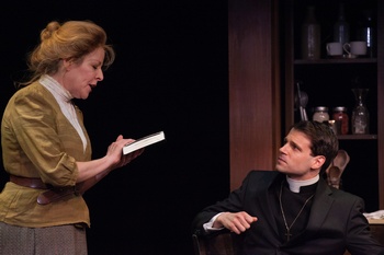 Mary Mallon (Tasha Lawrence), employed often in the United States after moving here from Ireland, carried with her and transmitted to others typhoid fever. The play is situated, mostly, as Mary is confined to a cottage on North Brother Island in Bronx, New York. Overseen and managed by Riverside Hospital, her residence includes wooden chairs, well-worn kitchen appliances, and a bed. Brian Prather's set design, representing 1909/1910, immediately transports the observer to the locale. Devoted to her Bible, Mary does not heed the insistent doctors who are certain that she was and still is in the process of infecting others with disease. Dr. William Mills (Kevin O'Rourke) and, most ardently, Dr. Ann Saltzer (Keri Safran) attempt to break through Mary's adamant thought process. Take your pick: religious belief or scientific truth. Mary vows that her way, through faith, is the only way. Dr. Saltzer, smart and demanding, requests that Mary peer into a microscope to better understand germs. Mary will not. The physicians devise a plan, through injections and pills, to rid Mary of infection by infusing her body with a multitude of germs. Mary is certain she did not commit any crime and will not have her body surgically modified. Sarah (Frances Evans) is an 8-year-old girl for whom Mary lovingly cares. Mary converses with the child, tries to reassure her. The presence of Sarah allows for Mary to exhibit a tender, maternal side. Typhoid Mary opens with Sarah saying "Hello." She and Mary, in July of 1909, have a conversation. It seems that Sarah's mother previously hired Mary to cook (at a time when Mary was a carrier). The short scene concludes and when the action resumes within Mary's confined room, Dr. Mills and Dr. Seltzer explain that Mary has, by now, brought illness to a multitude of others. Actor Miles G. Jackson is double cast but most often embodies Father Michael McKuen. The clergyman tries to reach Mary but is puzzled or confounded by her. However, he and Mary are at least able to have a discussion. The only person to whom Mary is civil appears to be Sarah. Mary and Sarah talk about families, that Sarah wishes to grow up and become a cook and so forth. The inclusion of Father McKuen and Sarah create room for Mary to demonstrate more humane parts of her character. Otherwise, she is steadfast to the point of obstinacy. Persuaded that only she has a corner on her medical situation, Mary will not listen to others. This is especially infuriating to Dr. Saltzer. Matthew Penn, with impressive film and stage credits, directs this intimate play which snags and effectively holds attention throughout. This acting group performs with specificity. Heading that list is Tasha Lawrence as Mary. Mary is thorny from the outset as she demonstrates just what she thinks of medical assessment and advisory. Mary Mallon grew up poor but worked for wealthy families; she knows various fiscal circumstances. Dr. Ann Saltzer tries to force and coerce, but that just will not work when it comes to Mary. Stalemate. The story surrounding Mary Mallon is accessible through research. This merit-worthy production succeeds through Mark St. Germain's ability and insight as a dialogue writer. The play, benefitting from Penn's deft staging, very much educates and sustains. Suffice to say that this is a prescient moment for producing Typhoid Mary. The current era is one which scientific evidence, regarding other issues, is viewed as either credible or questionable. Mary made her choice, pertinent to her condition, and many human beings were victimized. Typhoid Mary, through June 16th, 2018, on Barrington Stage Company's St. Germain Stage, 30 Union St, Pittsfield MA. For tickets, call 413-236-8888 or visit barringtonstageco.org. |