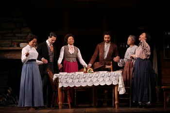 In the fall of 1898, willful Sophie Washington (Nikiya Mathis) shares coffee with Miss Leah (Brenda Pressley), a crusty, outspoken elder. They are situated near Nicodemus, Kansas, an all black community. The women are determined to hold fast to their land, even as white people hope to purchase it. The women are homesteaders having a discussion inside a home artfully designed by Marjorie Bradley Kellogg. Sophie also has plans to create a school in town. Miss Leah will speak of her days as a slave and of her children whom, for one reason or another, she lost. Fannie Dove (Brittany Bradford) arrives with Wil Parish (Edward O'Blenis). Fannie is sweet and attempts to bring peace when others' tensions escalate. A bit later, Minnie Dove Charles (Keona Welch) comes along with her husband Frank Charles (Michael Chenevert). Minnie is the younger sister and has been living in England with her husband. Minnie is pregnant and misses home; she claims she loves her husband, who is physically abusive to her. Later, Frank is vocal about the money Sophie and Fannie could make if they sold to white speculators. Frank is of mixed heritage, lighter skinned than the women, and could possibly be mistaken for being white. While Sophie is not a blood relative of Fannie and Minnie, she (a bit older) has watched over them in big sister mode. Sophie will not stand for inequity and lack of justice. She is vociferous and most capable. She has great pride when it comes to race and lives in the present with an eye toward the future. Sophie serves to contrast Frank, who, to understate, does not celebrate his black heritage. The action occurs several decades after The Civil War and the women, given emancipation, have moved westward. Miss Leah is fiery and bold. She vividly recalls life in the South; it was a time when she was powerless. Sophie and she are thinking about future generations and they will do everything possible to ensure that Nicodemus remain an all-black town. Playwright Cleage honors history with her play, one charged with spirit and resolve. Flyin' West was written during the early 1990s and the playwright followed, in 1995, with Blues for an Alabama Sky. Clearly, her thematic intent is to present women who have left oppression behind and instead thrive with opportunity to create, grow, and serve future generations. Seret Scott, whose direction of Native Son at Yale Rep this past fall was also commendable, allows and encourages the women in Flyin' West opportunity to create and live within their characters. Michael Chenevert captures unlikable Frank, a non-sympathetic personality with precision. Edward O'Blenis, on opening night, was a bit hesitant both with his lines and grasp as Wil Parish. Perhaps the performer will become more confident as the run continues. When considering thematic import of Flyin' West one could argue that its messages and meaning, while valuable, are not all that new or different. Still, this is a highly dramatic production and one which is richly pertinent. The characters drive the plot, one which is awakening. Many individuals in contemporary America grapple with racism and its ramifications. That does not grow old, nor does this show. If the first act is a tad lengthy, it is offset by the fervent conclusion of the play, a forceful work. Flyin' West, through June 16, 2018, at Westport Country Playhouse, 25 Powers Ct., Westport CT. For tickets, visit westportplayhouse.org or call 203-227-4177. |