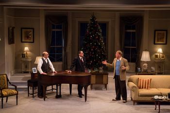 Joining for talk and drink are Harold Arlen (Philip Hoffman) and Jimmy Van Heusen (David Rasche). They take turns singing solo and sometimes together. A multitude of lyrics from songs are presented and some full numbers. Arlen is probably best known for the score for the movie The Wizard of Oz. He also contributes "Between the Devil and the Deep Blue Sea," "The Man That Got Away," and many more favorites. Van Heusen, the youngest and flashiest of the three men, often speaks of his close connection to Frank Sinatra. He's known for songs like "All the Way," "Darn That Dream" and "Swinging on a Star." Designer Randall Parsons furnishes a period perfect Manhattan townhouse. The Christmas tree toward the rear holds many colorful ornaments. Furniture and lamps, all subdued, immediately recall interior decor of that era. Even a glimpse of the set immediately transports a viewer backwardinto the mid-1950s. Each of the men is dressed differently (by costumer David Murin) according to his style. Arlen is saddened, bereft since his beloved wife Anya is in a sanitarium. He hopes in vain for her return to health. HIs dialogue usually includes mention of her. Berlin genuinely commiserates. Van Heusen is respectful, but his own reputation speaks reams. He has been known to spend time with prostitutes. It is Berlin, already a legendary composer, who, wearing a three-piece suit, tends to lead. He is not certain, however, that he has (at this point in time) received sufficient musical acclaim. Gregg Edelman does a very fine job as director, pushing pace through the 85 or 90-minute show, and Daniel Mollett (music director and pianist) is invaluable. Kalcheim has written for theater, film, and TV. He received an Emmy Award for "All in the Family" and worked on television's "The Paper Chase," too. His scripting, as is everything else about the production, is smoothly successful. Berkshire Theatre Group brings together three formidable actors; they have accumulated impressive lists of appearances in various roles on stage and screen. To watch this presentation is to enjoy professionals who seem to have been on stage together for far longer than a few weeks. The show's final number could be its most exhilarating; nothing more to be revealed here. Coming Back Like a Song! is comfortable theater and most pleasing. It surely satisfies one's yen for upper-level live-stage entertainment on a summer evening or afternoon in the Berkshires. We feel easy and familiar with the men before us. The imagined grouping is successful, and the differing styles and musical deliveries of the actors enlivens. Time spent with these men is gratifying. This particular production is finiteto be savored while watching. Coming Back Like a Song!, through July 21, 2018, Berkshire Theatre Group, on the Fitzpatrick Main Stage, Stockbridge MA. For tickets, call 413-997-4444 or visit www.berkshiretheatregroup.org. |
