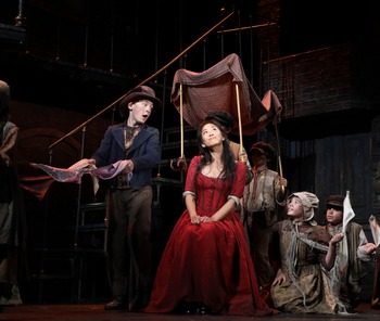 Director Rob Ruggiero has done his customarily strong work in presenting Oliver! and his cast is uniformly good, with a few actors managing to really stand out. Ruggiero also works brilliantly with his design team; Michael Schweikardt's two-level set is absolutely stunning. The atmospheric feel is fully supported by Alejo Vietti's wonderful costume design and the striking lighting design by John Lasiter. But this production is much more than just good looks. Lionel Bart's score sounds great, as sung by this company of actors, and just about every role in the show is expertly filled, with Donald Corren's Fagin and EJ Zimmerman's lovely Nancy shining brightest. As the title character, Elijah Rayman looks appropriately fresh faced and he is a terrific vocalist, with especially fine renditions of "Where Is Love?" and "Who Will Buy?" Actually, the performances of all of the young actors in the show are satisfying and they do a good job collectively singing the full company numbers, "Food, Glorious, Food," followed closely after by the title song. Speaking of young performers, Gavin Swartz is just dandy as The Artful Dodger, leading an enticing "Consider Yourself." Richard R. Henry is the perfect Mr. Bumble and Brandon Andrus is downright terrifying (as he must be) as the dangerous Bill Sykes. When Zimmerman makes her entrance as Nancy rather late in the first act, she is like a breath of fresh air. Wearing a gorgeous red dress, she seems to lighten up the whole show and does extremely well with "It's a Fine Life" and the infectious second act opener, "Oom-Pah-Pah." She is truly at her best in Nancy's big song, "As Long as He Needs Me," which she sings to a fare-thee-well. Zimmerman's Nancy is enormously touching in her devotion to Oliver and one can almost understand her tragic attraction to the abusive Bill Sykes. As Fagin, Donald Corren is a real charmer, making the most out of all of his lines and being quite believable in this rather dastardly, yet comedic, role. He is quite persuasive in "You've Got to Pick a Pocket or Two" and does a pleasurable job with "Be Back Soon." His real showstopper is the second act anthem, "Reviewing the Situation," and the actor is both hilarious and desperate as he sings about the dilemma Fagin is faced with and he seems to grow funnier and more charismatic as he delivers the number. Complementing Corren's work, director Rob Ruggiero has added a nice touch that brings to mind Fiddler on the Roof, which Ruggiero successfully staged at Goodspeed Opera House a few years ago. The ever reliable and fantastic music director Michael O'Flaherty leads the offstage band beautifully, and a word must be said about the impressive choreography provided by James Gray, which is all the more remarkable considering how small the stage is. Oliver! truly excels where it counts in Goodspeed Opera House's production, namely in the fabulous singing by the entire cast and the show's authentic look and feel of Victorian England, making a visit to this show highly engaging. Oliver!, through September 13, 2018, at Goodspeed Opera House in East Haddam CT. For tickets, please visit www.goodspeed.org or call the box office at 860-873-8668. |