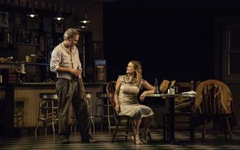 The play takes place after the Great Depression in the middle of nowhere, in this case a barbecue restaurant that feels like a diner with a bar. There is an unseen gas station just outside. Wilson Chin's evocative set includes a few old tables and chairs, stools, and a lot of booze bottles. For a time, Gabby Maple (Rebecca Brooksher) and Boze Hertzlinger (Shawn Fagan) are having what might be called a conversation. He still wears a football jersey (as he speaks often of his smalltime gridiron exploits) and she is alluring in a lightly colored dress. Both of them know that Boze is intent upon bedding Gabby, a young woman born in France where her mother still lives. Gabby reads poetry and this is a match for drifter Alan Squier (David Adkins) who walks into the bar. Here is a man who now hitchhikes and has wandered through Arizona near the Petrified Forest (known for wood and fossils). He has been a writer, is currently divorced, and hasn't a cent to his name. Loquacious and personable, Alan attracts the much younger Gabby. Sherwood wrote in a bunch of other catchy characters. Jason Maple (Sean Cullen) runs the bar and he is very much a conservative gun-toting American. Jason's father Gramp (John Thomas Waite), with his floppy white hair, is a jokester who pretty says anything that floats through his mind. One focuses attention upon Gabby and Alan. She hopes to get to Bourges, France, and relocate with her mother. Alan spins tales of his life and times. All of a sudden Duke Mantee (Jeremy Davidson) arrives upon the scene. He and his bad guy buddies are evidently fleeing cops who are after them. One of Duke's men is Ruby, played by Joey Collins, who is often a presence in BTG shows. Additionally, Sherwood provides Mrs. Chisholm (Jennifer Van Dyck) and her husband Mr. Chisholm (Walter Hudson), who provide comic moments. Thus, the stage is filled. During the first act, the banter is of interest but, to be sure, little action transpires for quite a while but that changes. David Adkins, as Alan, is well-worn yet charismatic and, perhaps, enigmatic. Rebecca Brooksher plays Gabby in both an understated and fetching manner. No wonder she has the attention of both the boisterous Boze and weary Alan. Gabby and Alan, in separate spheres, consider possibilities. She, hardened by existence within shabby confines of the restaurant, is uncertain whether she can get out or if she must settle for Boze. Alan has experienced a great deal, having lived in Europe, struggled with marriage, authored something or other. Adkins has multiple Berkshire Theatre Group excellent credits. Many might have seen his appearances on television's "Homeland" or "The Americans" or other programs. He is a skilled, versatile, disciplined actor. Brooksher, working with Auburn at BTG for the fifth time, is, in this show, compassionate and sensitive. She also shows the strength of her character. Director Auburn manages to balance the important relationship Gabby and Alan explore with the shenanigans of some of the others. John Thomas Waite (a seasoned actor with impressive New York credits) gets the spotlight with his portrayal of Gramp Maple, an irritating presence, really. Duke, oftentimes sitting by himself in the back room, looks like he (similar to others) might be mulling something over as if caught in thought. Playwright Sherwood provides much dialogue, dominant during the first act. This fine play, though, is extremely well-structured. It shifts into a higher gear before intermission and the second act is continually active. The Petrified Forest, through August 25th, 2018, at Berkshire Theatre Group's Fitzpatrick Main Stage, 83 East Main Street, Stockbridge MA. For tickets, call 413-997-4444 or visit www.berkshiretheatregroup.org. |