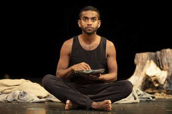 A Visitor (Hayley Carmichael) narrates early by introducing Mavuso (Hiran Abeysekera), a wiry man who has killed his father for sleeping with Mavuso's sister Nadia (Kalieaswari Srinivasan). Mavuso, too, has had sexual relations with Nadia. Much of the story is charted through Nadia's appearances, whether they be soon thereafter or some years later. Much larger than Mavuso is his uncle Ezekiel (Hervé Goffings), who inflicts punishing pain upon his nephew. For his crime, Mavuso is commanded to sit in front of a prison (here, facing the audience). Mavuso does not, however, ruminate and replay what he has done. David Violi's set consists of tree stumps, some dead branches and wood shavings. The walls for this production are black. Mavuso has almost nothing to fill his stomach. His initial sentence of two decades of staring at rather than functioning within the prison is shortened. Mavuso, for example, either imagines or actually eats a runt or rat or other creature he discovers. He sits or walks around his seeming desert confines. All is barren. Ezekiel returns and prison guards come. The poignancy of Nadia's appearances to see Mavuso cannot be understated. These siblings committed incest and she truly cares for him. Mavuso is not a simplistic man. Brook and Estienne wisely elect not to provide him superfluous explanatory dialogue. He is not grand of stature but a physical presence, once climbing a stage left ladder. Mavuso tends to dart about. His crime, though, remains unspeakable. The decision to have the guilty young man spend his days across from rather than inside the imagined prison is pivotal. His is a treacherous predicament, since only he can experience it. Were he one of many inmates, Mavuso might have experienced community. Is killing ever justifiable? That question hovers just above the surface as The Prisoner runs its course. Only Mavuso can gain himself redemption; no one else is capable of assisting. Ezekiel is highly complex: he hurt Mavuso but then steps forward so that his nephew will not have to spend 20 years staring at a building. Mavuso, however, is forever guilty. Movement within The Prisoner is specific and graceful. Even as characters walk, they are meticulous and disciplined. Nothing is rushed. Brook and Estienne clear space for some significantly silent moments. These sequences are potent and nerve wracking. Should those watching fill in the blanks? Will Mavuso break the trance and become far more loquacious? Abeysekera, a performer from Sri Lanka, is a most versatile Mavuso. He seems to hear birds chirping, or does he? Srinivasan's Nadia is heartwrenching through her plight and then aspirations. Goffings, a French actor, has the difficult task of playing Ezekiel, a man who can be brutal or gentle. One is left with lingering unanswered thoughts concerning Nadia. She is left wanting. She must, of necessity, be strong, but she hasn't any power. Nadia is is of utmost importance but the character would benefit from an augmented voice. Ultimately, The Prisoner addresses morality and conscience but does so in atypical fashion without endlessly driving home its theme. The play is unusual and it is never boring. The Prisoner, through November 17, 2018, at Yale Repertory Theatre, 1120 Chapel St., New Haven CT. For tickets, call 203-432-1234 or visit yalerep.org. |