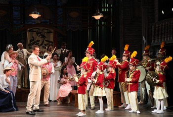 Meredith Willson began writing The Music Man in 1951, and it was a smash when finally arriving on Broadway in December 1957. The show garnered five Tony Awards. Willson wrote book, music and lyrics while Willson and Franklin Lacey furnished the story. It draws theatergoers back to the Midwest in 1912, perhaps a forgotten era. Willson grew up in Iowa and chose River City, Iowa, for the setting of musical. Harold Hill (Edward Watts) comes to town and claims he will rally boys into a band. There's something in it for Hill, who calls himself a professor, too. Parents pay for uniforms and instruments and the music leader (who actually hasn't any notion of conducting) will then pocket the money and get out of River City. Hill finds that Marian Paroo (Ellie Fishman) is the only person around who has musical knowledge. The town librarian, she also teaches piano to children. Not surprisingly, a romance is in the offing. The music man is intent on wooing the librarian who is, at first, standoffish. Eventually, Marian, now visibly attracted to Harold Hill, persuades him not to leave town but, instead, stay the course. A contingent of kids come on stage and play instruments if not with sublime effectiveness, with some promise of better sounds to come. All's well that ends well as Harold and Marian embrace and one is left to imagine their future together. It took more than 40 drafts of scripting to finalize The Music Man. Various subplots effectively support the main story, one enacted with authenticity by the male and female leads. It's a pleasure to report that this production should work well for those who have seen one or two or eight or ten versions of the show; and it will also charm theatergoers new to this classic work. Actress Ellie Fishman is perfectly cast as Marian Paroo. Having appeared with the 2017 Goodspeed presentation of Rags, she is perfectly on pitch on tunes such as "Goodnight, My Someone," "My White Knight," and, memorably, the endearing "Till There Was You." She plays, at first, the constricted librarian (thanks here and elsewhere to David Toser for lively, suitable costuming) who then blossoms when realizing that Hill could be hers. It is somewhat more difficult to assess actor Edward Watts as Harold Hill. The Broadway, Goodspeed, and regional theater veteran is poised, has a strong voice and fine grasp of his role. It is not Watts' issue that he does not sport the look of a shyster who is attempting to pull off a fast one on the naive folks living in River City. Watts appears very well scrubbed and almost matinee idol handsome. Think, perhaps, of a very youthful Robert Goulet. One cannot question the actor's adept performance. For an observer who is well-versed in the show, part of the fun is anticipation. It is difficult to imagine a more pleasing quartet of singers than Jacey Squires, Oliver Hix, Ewart Dunlop, and Olin Britt. Listening to them harmonize on "Lida Rose" is an exceptional experience unto itself. Actress Amelia White, who plays Mrs. Paroo, Marian's mother, is a hoot. Goodspeed does well to assemble a cast which includes people of all complexions, and virtually all of the performers fully realize their capabilities. Director Thompson has carefully and proficiently rehearsed children, some of whom are pivotal, with splendid results. In addition to songs mentioned earlier, recognizable numbers such as "(Ya Got) Trouble," "Pick-a-Little (Talk-a-Little)," "Gary, Indiana," and, of course, "Seventy-Six Trombones" resound throughout the comfortable theater. Call this a festive, merry, and also most-disciplined rendering of The Music Man. The Music Man, through June 20, 2019, at Goodspeed Musicals, 6 Main St., East Haddam CT. For tickets, call (860) 873-8668 or visit goodspeed.org. . |