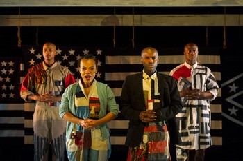 Certainly satirical, America v. 2.1 finds four actors (play within a play here) who must perform again and again with the same lines. This is, for them, both wearing and exasperating. Donavan (Ansa Akyea), leader and facilitator, issues instruction to sweet-singing Grant (Jordan Barrow), angry Jeffery (Peterson Townsend) and Leigh (Kalyne Coleman), the only woman on stage. Every so often, Donavan listens as what is evidently a white voice (Peggy Pharr Wilson), from above or afar, issues instructions. It's all about the real and honest hurdles and obstacles black people have had to either leap over or elude in order to stand a chance of gaining equal footing in this country. Rose, however, deliberately scrambles names of some personages, such as Rosa Sparks, Donald Reagan, Jesus Christ Lincoln, and many more. One recognizes the combination, for example, of Bill Clinton and Bill Cosby fused into one individual (Akyea has this part), but the portrayals are almost always exaggerated and/or stretched to a limit which does approach absurdity. It is all told from a vantage point which is, perhaps, a few years forward from 2019. The primary messages are clear: this group of actors is overworked and conflicted; and their experiences as black performers compromise them. They can be separated from those they love and they might not ever find themselves fulfilled. Still, when observing these proceedings assumes that all is bleak and negative, the playwright offers glimmers of hope. Perhaps it is possible to wage a winning battle against the ruling class. If so, subservience in society might be eradicated. If you wish, this is a play about freedom. Turning over that symbolic coin, it is about slavery. The irony of watching such gifted actors portray characters those whose work requirements and schedules are oppressive is not lost. The production highlights multiple genres, including spoken word, music and movement. Rose's actualized script is energized and Boseman's choreography is crisp and sharp. The creative duo is fortunate to work with actors who are athletic and able to execute, when it applies, in unison. All of the actors are convincing. The exceptional Barrow, trained in musical theater, hits all the high notes without the slightest indication of strain. It's easy to imagine him singing almost any melody and racing up an octave to do so. Akyea's Donavan is a man in charge of the troupe, but he knows that his is not the ultimate voice. Scenic designer Jack Magaw shows a couple of backstage clothing hooks and garments on either side of the stage. No ornamental scenic pieces clutter up space. This is all about opening up the stage for actors. Ntokozo Fuzunina Kunene's costume choices are entirely suitable and help set a tone. America v. 2.1 will cause many a theatergoer to squirm even while laughing just a bit at an exchange on stage. The sad truth is that the American Negro has already been targeted with extinction, so that condition (as described in the play's title) is not so much eventual. Rose, through her pen or laptop, writes a commentary which is lively and soul-searching, too. It bids anyone watching to think two or three times and then consider, while driving away, the implications. America v. 2.1: The Sad Demise of the American Negro, through June 30, 2019, at Barrington Stage Company, St. Germain Stage, 30 Union St., Pittsfield MA. For information and tickets, visit barringtonstageco.org or call 413-236-8888. |