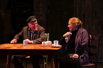 The scene, some time ago, is in Ireland and the confines are rough hewn. The interior set shows walls of gray coarse wood. A table is well worn and an overloaded sink has clearly seen better days. Set designer John McDermott later turns to a different look, which includes, on a rear canvas, a lovely vista of farmland. The play opens as Tony Reilly (Jeffrey DeMunn) engages in conversation with Aiofe Muldoon (Deborah Hedwall). Neither is in the best of health and they speculate about who will die first. Tony owns the family farm and wishes that his son Anthony (James McMenamin) would be more connected to the earth and thus a fitting successor. Tony muses that he might just leave the land to an American relative. The farm next door, so to speak, had been run by Chris Muldoon, Aiofe's recently deceased husband. Her daughter Rosemary (Shannon Marie Sullivan) tends to some of that land just now. It seems that when Rosemary was six years old, Anthony pushed her down and she has neither forgotten nor forgiven him for the incident. Rosemary smokes a pipe or cigarettes and, when we first meet her, she is stubborn and boisterous. Call her unfriendly. She does learn that Tony might yield that farm to Anthony's cousin and this does not sit well with Rosemary. Meanwhile, Anthony (introverted and cautious) never recovered from a relationship, years before, with a certain young woman. Anthony, perhaps curiously and perhaps not, seems to hear sounds when he is in the fields but is not always tuned in when humans speak to him. "I'm just more with nature ... than people," he says. During many of their scenes, director Allen has chosen, when Anthony and Rosemary are speaking toward one another, to have them separatedsix feet apart. The question is whether that physical distance can be bridged. Moreover, the space between them is symptomatic of much more. The early going banter, between veteran actors DeMunn and Hedwall, includes a fair portion of wry comedy. Shanley's back-and-forth is crisp and the performers, complete with appropriate accents, accommodate the dialogue with both delivery and facial expression. Later, the script turns in another direction as Rosemary and Anthony attempt to find something: themselves, peace, harmony and more. Ultimately, it is a play of loneliness, sorrowful anticipation of imminent death, and potential love. Shanley does not rush. He allows for deliberate pacing and his expository section beautifully sets up a blossoming conclusion. It is not by chance that the author is the recipient of Pulitzer, Tony and Oscar awards. His script, as it transpires within the confines of the cozy Unicorn, unfolds by increments and this is all to the good. Fans of TV's "Billions" will recognize Jeffrey DeMunn, who plays Chuck Rhoades, Sr. on that show. For some, Karen Allen's name will ring bells. A performer on stage for years, she might be best recalled for her work on the large screen which includes Raiders of The Lost Ark and Animal House. Outside Mullingar, through July 13, 2019, Berkshire Theatre Group, Unicorn Theatre, 6 East St., Stockbridge MA. For information and tickets, call 413-997-4444 or visit www.BerkshireTheatreGroup.org. |