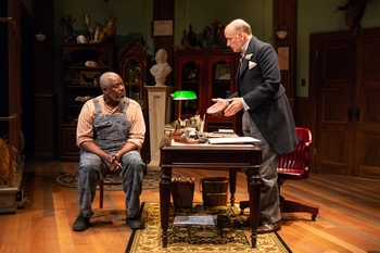 In 1906, a youthful Congolese man named Ota Benga (Antonio Michael Woodard) is placed in a cage at the Bronx Zoo in New York City. To make certain that Ota stays in place, a black man whose nickname is Smokey (André Braugher) is assigned to guard Ota. Smokey, himself, is a prisoner. He pilfered some apples and had to serve time. Thus, we have someone who is convicted watching another human being who has been forcefully placed in captivity. The head of the Bronx Zoological Park is William Temple Hornaday (Frank Wood), a white man. Initially, he discusses with Smokey just how important it is to keep a close eye upon Ota. Three black minsters come along: Reverend William Slater (Sullivan Jones), Reverend George Sims (Keith Randolph Smith), and Reverend James Gordon (Jeorge Bennett Watson). While the public is quite taken with the exhibit of the pygmy at the zoo, the clergymen are not in favor of holding someone within the bars of a cage as people gape at him. The reverends attempt to influence Smokey. The catch in any scheme for Smokey is that, as he facilitates further liberation for Ota, it might be to his own detriment. Smokey is attempting to gain his freedom and this could be jeopardized if he advocates for Ota. Still, during the second act of this play which in entirety runs just over two hours, Smokey goes to Mr. Hornaday and recommends that Ota be given "a break." By now, Ota and Smokey have developed a friendship. Payne's absorbing script also includes moments of levity. The two men, one very large in stature (Smokey) and the other far more compact (Ota), enjoy one another's presence. Director Whitney White gives them time together, without others, for back-and-forth discussion. There is a lovely scene in which the two men sit at the very front of the stage and try to figure it all out. These moments are quite precious. Shortly thereafter, Ota delivers an insightful monologue to the audience. Watching the play, it feels that it is all truthsuch, to his credit, is the authenticity of Payne's dialogue. Yet, there is, evidently, no record of Ota Benga's thought process or his actual words. Payne imaginatively and quite successfully paints and endows this man with purpose, aspiration and, above all, a drive to become emancipated. Late in the play, a final character named Samuel Phillips Verner (Matthew Saldivar) enters. Without divulging too much plot, his is a pivotal role but I wish his presence could somehow have been integrated into the show far earlier. As it is, this appearance, which does provide framework and context for everything, feels too much like an add-on rather than a key component. A Human Being is exceptionally well enacted as talented leads André Braugher (with numerous credits including an Emmy Award) and Antonio Michael Woodard (a Brown University M.F.A. graduate) snare attention with each word and movement on stage. Lawrence E. Moten III has furnished a set which is dominated by a larger than life cage. Behind and above it, on a rear wall, various stuffed heads of slain animals stare forward. Mr. Hornaday, zoo administrator, sits at a wooden desk to the side. This is a brand new play and a fascinating one. Payne has said that it was some years back, when he was in a Barnes & Noble, that he came across the book, "Spectacle: The Astonishing Life of Ota Benga," by Pamela Newkirk. Payne mused upon how a human being could stand such constriction within a primate house. The playwright imaginatively draws focus to the forced display of a real individual. Payne's vision and writing dexterity follow. The exhibit is, one gathers, popular and winning, but at what price? A Human Being, of a Sort, through through July 7, 2019, at Williamstown Theatre Festival, Nikos Stage, 1000 Main St., Williamstown MA. For tickets, call 413-458-3253 or visit wtfestival.org. |