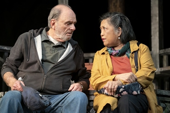 Tim (Stephen Barker Turner) is a capitalistic guy who hopes to replace an entire graveyard with a cold storage factory. In the midst of his own marital separation, he is sleeping with Donna (Jennifer Mudge), another realtor who is trying to get her own life organized. It so happens that Righty (Harris Yulin), who is slow moving and perhaps dealing with something like Alzheimer's, is determined to get himself buried in Briarwood Cemetery and he has a handsome and large gravestone at the ready. His wife Joanne (Mia Katigbak) is sound of mind and articulate. She is loyal to her husband and hoping that the struggle through old age (for both of them) is not amplified. Also on the scene is Grey (Jimonn Cole), an architect and environmentalist who sometimes stands apart, literally, from the couples. At an easel, he is also painting the scene, complete with its trees and greenery. Grey appears to care about the property. Eno is a gifted playwright and he devises a much fuller storyline which encourages ramifications to sneak up on the viewer. These occur after a longish opening as the characters are introduced. During the first portion of the play, the strength of the back-and-forth dialogue is undeniable, but one may begin to wonder where, if anywhere, this will go. The author then begins to layer his characters. For example, Righty is more thoughtful and multi-dimensional than it once seemed. Thus, Harris Yulin (who was distinctive in a supportive role in television's "Ozark" fairly recently) has the difficult job of embodying a man who appears to be linear but ultimately is not. Yulin, a distinctive stage actor for many decades, is a strong and adept performer. He does not rush; he permits Eno's lines to settle. Righty says, "I'm old and scared and poor." Suffice to add this: Righty is neither simplistic nor simple. To his credit, Eno drives the show through four characters who are thinking past the obvious and/or are influenced by unforeseen circumstances. Only Grey continues to be the man we see early on.