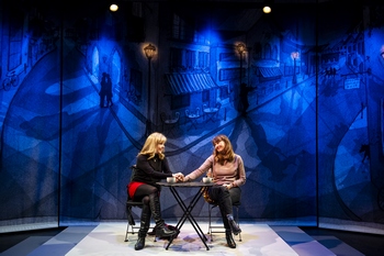 We find two women sitting at a small table outside a coffee shop in Dublin. Cora (Nicole Ansari) and Anna (Michelle Joyner) are old friends who have not seen one another for quite a while. Predictably, they banter about weight loss and men and then gently philosophize. That conversation concludes and the next scene finds Cora speaking with Denise (Elizabeth Aspenlieder), who provides details on the birth of her child. We hear that Oliver, Denise's first husband (who was at a certain period involved with Denise's sister Anna) has passed on and that Cora's dog died. Cora, becoming serious, asks Denise how she feels about Anna. Denise replies, "I was the wronged one in this, not her." Cora soon walks off stage and Anna reappears to engage with her sister Denise. The time frame has shifted forward some years and the discussion focuses upon that certain man, Oliver. Cora recalls both Anna and Denise during times, more than a couple of decades ago, when all were close friends. The calmer and, in a sense, third woman, she does show empathy as a human who is less besieged by demons. Author O'Rowe is not going to connect the plot's figurative dots, and this 90-minute drama's tension heightens while questions dangle in the air. The story grows darker when it moves on, even as enigmas remain unresolved. In a sense, The Approach evolves like a miniature Anton Chekhov; some feel not enough actually happens and express a desire for more action in the Russian writer's plays. The Shakespeare & Company presentation is precisely enacted and takes place before a lovely and long mural-like painting devised by Jim Youngerman. The show is co-directed by Mark Farrell and Tina Packer and requires virtually no movement. The configurations vary, yet two women are always sitting at what appears to be a wrought-iron table. This is a play about women, but unseen men are pivotal. The script does contain hints and implications are of import. Each woman is lacking in her life and, finally, hoping for emotional stability. Each also has a somewhat different recall of their common past. Perhaps there's a longing for that former existence which was simpler and less grueling. The truth, elusive, cannot be located amid ambiguities. Through its atypical format, most of The Approach exerts a strong hold upon observers, all of whom are situated fairly close to the actors. O'Rowe has his characters present some identical initial dialogue for a second time near the conclusion, but why? It's logical to wonder, too, about the title. It could refer to an overall approach or the one each woman employs or something else entirely. The three actors are splendid with their responses to one another, with accents and enunciation. They have developed a knowing and intuitive sense of one another. Each character, a person in middle-age, is searching. If some of the dialogue is contradictory, that is real, that is life. Here is a quick non-sequitur for a theatergoer seeking something less stressful: should you be a fan of crosswords, fret not since there's reference within this show. The Approach runs through May 29, 2022, at Shakespeare & Company's Elayne P. Bernstein Theatre, 70 Kemble St., Lenox MA. For tickets and information, please call 413-637-3353 or visit shakespeare.org. |