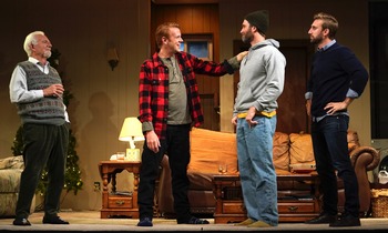 As patrons enter the theater lobby, they are greeted, through amplification, with loud hip hop lyrics vocalized by female rappers. This continues while two individuals whom we later find out are Person in Charge (Akiko Akita) and Person in Charge (Ashton Muñiz). Each walks the aisles to meet and greet those taking seats. This is of import since earplugs are offered as is an explanation that the blaring accompaniment (with profane reference to body parts) will soon end. The actual play, directed by the talented Mark Lamos, begins when two actors mount the stage and articulate their gender identifications and backgrounds. Ed (Richard Kline) has been alone since his wife died, but he now houses the eldest of his three sons, Matt (Denver Milord). They appear in the finished basement area of the family home. Matt, bright and well educated, has a major student loan debt on his hands. He claims to be pleased just working at a small copying place which has a community affiliation. Middle brother Jake (Bill Army) has made quite a bit of money but is divorced. He is not averse to rough-housing with the youngest brother, Drew (Nick Westrate). Drew is a novelist and teacher, a man who also plays great value in therapy as a means to mental stability. The siblings are unlike one another and espouse numerous theories as does their father, who is quite warm. Early on, a game of "Privilege" is showcased. The sons' late mother transformed and visually modified "Monopoly" to the current format which is on display this very Christmas Eve. The progressive mother had people (through her edited version of the game) going directly to jail should they be white. Kristen Robinson's appropriate set also includes a fake Christmas Tree, a sofa that looks extra-comfortable, and all proper trappings. The men revisit holiday traditions as they wear plaid pajamas (thanks to costumer Fabian Fidel Aguilar). A meal of take-in Chinese food seems just the right fit. Gradually, Matt's decision-making becomes a focus, since some worry that this Harvard graduate should be making more of himself. Jake would probably let his older brother cope but Drew is certain that Matt could benefit from time spent with a great shrink. For sure, it's all about four straight white men. Director Lamos pushes the pace and choreographer Alison Solomon does well to get Matt, Jake, Drew, and even oldster Ed dancing and moving. The brothers, probably all forty-something, are quite pliable and gymnastic. In fact, all the actors are physically dextrous and deliver their lines with understanding and precision, and a few moments of satire are quite effective. The brothers, for example, combine voices on a rendering of "Oklahoma!" with lyrics adjusted to KKK. That aspect of the show benefits the production. The Persons in Charge assist in scene transition, but they do not speak again until the very end of this production when they close the proceedings. If playwright Young Jean Lee's intent was to get her audiences thinking, she has succeeded. The Persons in Charge provoke contemplation even as they are very much separate and apart from the sometimes comic and sometimes dramatic goings-on amongst the four men. On the other hand, it's impossible not to wonder if not question the initial "music," complete with its invasive percussive beat, which is anything but soothing. Each of the men in the household represents a specific type and no one is completely repulsive. Raised by people who were evidently concerned about social justice, each brother falls easily back into good-old-days mode complete with behavior first demonstrated when they were kids. Much of Straight White Men is solid and fine yet not a whole lot more. Aside from the presence of the Persons in Charge (and their presence is certainly experimental), this type of work is conventional. Mark Lamos, however, makes a bold move by bringing a distinctive and singular play to a theater located within Connecticut's Gold Coast region. Straight White Men runs through June 5, 2022 at Westport Country Playhouse, 25 Powers Ct., Westport CT. For tickets and information, call 203-227-4177 or visit westportplayhouse.org. |