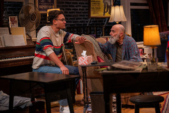 Pompey (Glenn Barrett) is an 80-something year old extrovert who spent much of his life performing vaudeville in combination with ragtime and comedy. Now, his apartment on Chicago's North Side is filled with junk, including emptied food cans, various pieces of clothing tossed every which way, stacks of newspapers, and so forth. The play opens in 1993, as he and longtime partner Ollie (Kevin G. Coleman) revisit the type of entertainment they'd enjoyed presenting for decades. It's not working and Ollie walks away. Marsha (Kristen Moriarty) arrives, finds her father's place a disastrous mess, and intends to have him placed elsewhere. It so happens that Pompey still runs a weekly workshop for the elderly. He hasn't any interest in relocating to any sort of retirement or old age facility such as "Eternal Springs." Marsha brings with her a teenage African-American boy she hopes to adopt. Jet (Logan Slater) has had too many negative experiences at group homes and he's both sardonic and cynical. Marsha goes on her way and leaves Jet to help clean up Pompey's room. The pair of almost comically mismatched souls find a common ground through music. Their contentious exchanges are intrinsically authentic. Each sees that a combination of Pompey and Jet, in performance, might work. Ollie has passed on yet, even from another realm, comes on stage to chat with his dear, treasured friend. The play gently closes and leaves an observer to contemplate old age, multi-generational and multi-racial relationships, the very act of survival, and more. Its impactful messaging sneaks up on the observer. The production builds incrementally and ultimately could not be more precious. Smith catches the viewer early on with his scripting, which is complemented by Theron Wineinger's staging. Pompey's small living area is first obscured by a reddish, transparent curtain within which the two aging performers "practice." Thereafter, the playwright layers the work with varying themes while mixing melancholic drama with wry, sometimes bittersweet humor. Director Golden helps actors shift in several configurations. Glenn Barrett's Pompey is the focal character and that actor, who has performed often in southern New England and also in New York City, blossoms as he evolves during the show. Barrett is physical, emotional, whimsical, and also wistful. Pompey is likable even as he's contemptuous at times. Coleman and Moriarty are excellent in supporting roles. Youthful Logan Slater first embodies Jet as a combative, disrespectful teenager who thoroughly disdains Pompey. The actor shows flexibility as he personifies a Jet who shifts gears according to Smith's storyline. The author needed to reimagine his initial work and his effort yields a piece which is complex when it comes to emotions and implications. Each of Golden's cast of actors seems to have an intuitive feel for his/her character. This is a shining jewel of a presentation, one which demonstrates that theater is an encompassing art. The splendid text requires acute, evocative interpretation, and this ensemble group is more than up to that task. There's just enough tension to balance the charm that smoothly transports theatergoers to another place. Golden Leaf Ragtime Blues runs through October 30, 2022, at Shakespeare & Company's Elayne P. Bernstein Theatre, 70 Kemble St., Lenox MA. For tickets and information, please call 413-637-3353 or visit shakespeare.org. |