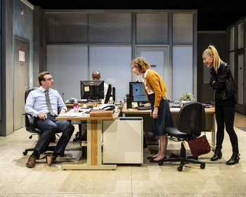 The author uses humor (often painful) to follow the lives of worker bees on the staff of a New York City magazine. The editors are unseen behind their office doors, the editorial assistants backbite and gripe about the lack of advancement, the interns mostly run errands, and no one sees the situation improving. ("People used to die. There was a thing called turnover," says one of them.) Everyone is anxious about the future and their place in it, which leads to sabotage and other ways of messing with each other's heads. Director Kip Fagan understands how the rhythms of office work can be frantic and stultifying at the same time. It's just another day, as Dean (Conrad Schott) turns up hungover again; Kendra (Eunice Hong) breezes in late after shopping; Miles the intern (Justin Weaks) avoids conversation by keeping his earbuds in; and Lorin (Ahmad Kamal) gripes about how the reason he's never been promoted out of the fact-checking department may have something to do with his majoring in French in college. Gloria (Alyssa Wilmoth Keegan) glides in and out: socially awkward, nervous, generally considered a "freak" by her co-workers, and smarting after almost no one attended her housewarming party the previous night. The first act leads up to a disturbing incident that changes the course of everyone's lives. When the second act picks up a few months later, one survivor is preparing a book depicting the event as an eyewitness, only to discover that two co-workers are doing the sameeven though neither of them was in the room when it happened. Keegan stands out in two roles that may have more in common than either one thinks; Schott has the central journey of the plot and ably conveys Dean's shift from careerist to someone just trying to get through the day; and the other four cast members give incisive performances as they try to make the best out of a horrifying situation. Scenic designer Misha Kachman has reconfigured the Woolly stage with a thrust area and walkway into the audience; part of the set is framed by a suspended "curtain" of frosted glass walls. Colin K. Bills' lighting design adds intensity and focus and Kelsey Hunt's costumes sharply delineate each character.