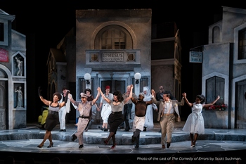 The similarities between the two productions are numerous, including the appearance of the set (James Noone's scenic design has hidden depths that reveal themselves when the turntable begins moving) and the interpolation of original songs (by Michael Dansicker, not Stephen Sondheim) as a breather between the scenes of nonsense. Paul directly steals from Forum by including in the cast three "Proteans" (Matt Bauman, John Cardenas, Justin G. Nelson) who appear in a succession of disguises and silly fake mustaches. Paul is a master of pacing who understands that the farcical complications have to fly past, while the more serious momentsthere are someneed more deliberate handling. His talented actors are skilled in both Shakespearean language and zaniness. The premise is that two sets of twins, the sons of Egeon of Syracuse (Ted van Griethuysen) and two adopted boys designated as the sons' servants, were separated in a shipwreck decades earlier, shortly after their birth. Antipholus of Syracuse (Gregory Wooddell) and his servant Dromio of Syracuse (Carson Elrod), now adults, have left their home in search of their missing brothers and arrived in Ephesus, which, as it happens, is at war with Syracuse. Meanwhile, unbeknownst to Egeon or the other two, their doppelgangersalso named Antipholus (Christian Conn) and Dromio (Carter Gill)live in Ephesus. Unlike the visitors from Syracuse, they are both married, Antipholus of Ephesus to Adriana (Veanne Cox) and Dromio of Ephesus to Luce (J. Bernard Calloway in majestic drag). As the twins are not only dead ringers for each other but wearing identical clothes, the confusion begins building, including an attraction between Antipholus of Syracuse and his supposed sister-in-law Luciana (Folami Williams). Wooddell and Conn are ardent, even impassioned, as matters become more and more confused, and Elrod and Gill are skilled physical comedians, but they aren't the focus here. Cox earns laughs and pathos as a woman with a hard shell over a wounded heart, while the other standouts are more outrageous: Tom Story as a louche goldsmith, all fluffy blond hair and shirt open to the navel; Eleasha Gamble as a courtesan who at one point wears a sexy porcupine costume (designed by Gabriel Berry); Sarah Marshall as Dr. Pinch, psychiatrist and free-lance exorcist; and Bauman as a dancing police officer.