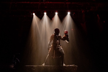 Most people are familiar with Irving's story about superstitious Ichabod Crane and the spooky Headless Horseman, set in New York state shortly after the American Revolution, but Tsikurishvili has decided to present the previously unknown story of what actually happened to the Horseman. Why should the tortured form of this Hessian mercenary (Scott S. Turner) ride eternally on his spectral horse (physically, an awesome puppet manipulated by three ensemble members; in spirit, the dazzling Maryam Najafzada)? Why can't he rest? Audiences may get an early hint of where the story's going with the casting of Ichabod Cranetraditionally portrayed as a tall, gawky, scarecrow-like figurewith Vato Tsikurishvili, a hulking man who (it appears) gets what he wants. He swaggers home victoriously from the Revolutionary War and, during a rowdy party in a tavern, steals pretty Katrina Van Tassel (McLean Jesse) away from his gentler friend Brom (Justin J. Bell). There's even a rapturous dance representing the couple's wedding night. Soon, however, the Headless Horseman starts killing people in the woods near Sleepy Hollow, removing their heads in an attempt to replace his own missing one. As it happens, Ichabod and Brom know more about the history of the ghostly figure than they've admitted, and it's all laid out in Irina Tsikurishvili's visceral choreography. Vato Tsikurishvili uses aggressive physicality to show Ichabod's sense of superiority and the fears he tries to hide underneath, while Jesse conveys both beauty and moral strength in the way she moves. The design team has created an imaginatively creepy forest setting, specifically Phil Charlwood's scenic design of metal mesh tree trunks wrapped in rags and pieces of furniture that seem to grow from the ground and Brian S. Allard's unearthly lighting design cutting through the haze in unnatural-seeming colors. Erik Teague's costumes ground the performances in period while still being fluid enough to allow free movement.