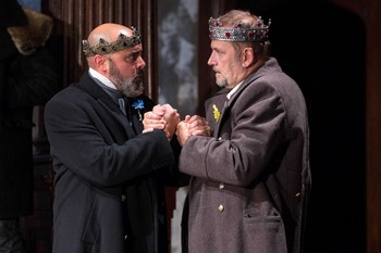 While John reigned from 1199 to 1216, director Aaron Posner has moved the setting to the Edwardian era of the early 20th century, with Sarah Cubbage's costume design centered on men in frock coats and vests and women in long gowns with high ruffled collars. The 12 actors, most of whom play multiple roles, lay out the themes of "politics and family and power" in contemporary language before the play begins. John (Brian Dykstra) became king following the death of his brother Richard the Lionheart and rules with the assistance of his mother, the august Eleanor of Aquitaine (Kate Goehring). However, King Philip of France (Howard W. Overshown) supports the claim to the throne of Arthur (Megan Graves), the teenage son of another of John's late brothers. Plots, politically motivated marriages, and interference from the pope all add to John's concerns - shown by the way he keeps tripping as he approaches the throne. The women are the ones to watch in this production, most notably Kate Eastwood Norris in the male role of Philip Faulconbridge, bastard son of Richard the Lionheart. Norris swaggers and rages, decrying the political machinations around her and how rulers will sell out their people for expediency; clearly, this character should be king were it not for the matter of his birth. Goehring is indomitable as Eleanor, a queen for many decades and prepared to go to battle at age 80; Holly Twyford is both determined and heartbreaking as Constance, Arthur's aggrieved mother; and Graves has some breathtaking moments as young Arthur. Maboud Ebrahimzadeh offers strong support in two roles and Elan Zafir is an insinuating presence as John's right-hand man. Andrew Cohen has created a rustic scenic design centered on John's wooden throne, which also represents a castle tower in one scene, and a suspended wooden circle that suggests a crown. Max Doolittle's lighting design balances the plain set with banks of lights whose blasts into the audience conjure up the clashes of battle.