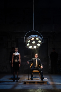To begin with, Debra Booth's scenic design turns the stage of Washington's Sidney Harman Hall into an enormous, empty industrial space with dirty walls and large swinging doors, not to mention a bank of lights (designed by Lap Chi Chu) that belongs in an operating theaterforeshadowing. There's no grandeur in the royal court of Edward IV (David Bishins) and Queen Elizabeth (Robynn Rodriguez), only scattered pieces of furniture. Lindsay Jones has fashioned a sound design of mechanized noise and slashing heavy metal music. As the malevolent Richard, Duke of Gloucester, Matthew Rauch manipulates the people around him but takes little pleasure in the results. So he frames one of his brothers as a traitor to the other, seduces the widow of a man he killed, and sways the populace to support him; he stays aloof through it all. Rauch does not play Richard with the traditional crooked back, rather depicting his physical disability with a leg brace, a cane, and on occasion a loping walk. In this production, the aggrieved women in Richard's orbit register more strongly than the central figure. Lizan Mitchell gives a blazing performance as Margaret of Anjou, widow of King Henry VI and mother of his son, both of whom were killed by Richard. Her furious curse is like an incantation. Rodriguez as a queen robbed of her crown and her sons, Sandra Shipley as Richard's tormented mother, and Cara Ricketts as the pitiable Lady Anne begin at cross purposes to Margaret but join with her as the bodies pile up. Muse has a pessimistic view of how a nation might deal with such an untrustworthy leader. Some of Richard's torturers wear white doctor's coats, eagerly helping the regime, and the people of England are a mob, easily led and ready for violence against whoever is the enemy at any time. They welcome Richard with their walking staffs and their knives and swords, reacting with the emotion Rauch spurns, but later they do the same for the man who kills him and takes power.