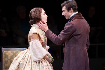 Sueko's measured direction makes clear every laugh line and every gasp-inducing moment of cruelty as Catherine Sloper (Laura C. Harris) realizes who she is and what she is capable of. Catherine is the daughter of Dr. Austin Sloper (James Whelan), living in a fine house on New York City's Washington Square in the 1850s with her father and her widowed aunt, Lavinia Penniman (the peerless Nancy Robinette). She has a sizable inheritance from her mother, who died giving birth to her, and will receive more when her father dies. While Catherine can be comfortable and even funny with her aunt, she shrinks into herself around her father, who has always found her a disappointment compared to the wife he lost. She enjoys embroidery and charity work; he berates her for her shyness and awkwardness in social situations. Things begin to change when Catherine's cousin Marian Almond (Lorene Chesley) brings her fiancé Arthur Townsend (Nathan Whitmer) to the house, accompanied by Arthur's cousin Morris (Jonathan David Martin). Morris is notably charming though penniless and works to draw Catherine out of her shell. Soon he proposes marriage to Catherine, who is dazzled. Dr. Sloper, convinced that Morris is a fortune hunter, finds ways to show his disapproval as Lavinia giddily encourages the romance behind the scenes. Harris portrays Catherine's growth not only in heart and mind, but seemingly in physical stature as well, thanks to Ivania Stack's costumes. She makes her first appearance in an overpowering, high-necked cherry red dress that appears to be dragging her down as she struggles against it. As she becomes more comfortable, so do her clothes. Robinette, one of Washington's most honored actresses, continues to be a treasure of the Washington stage. Lavinia seems silly and driven by moods, but that's a façade; she understands the realities of love and money. Martin is amusing and poised as Morris tries to defend himself, while Whelan plays Dr. Sloper less in anger than as an exasperated man who can't understand why things don't happen the way he thinks they should. Scenic designer Mikiko Suzuki Macadams has dressed, or perhaps overdressed, the in-the-round stage of the Fichandler with the elegant furniture and rugs of the family's drawing room and front parlor; Sherrice Mojgani's lighting design is more understated in keeping with the era of gaslight and candles.