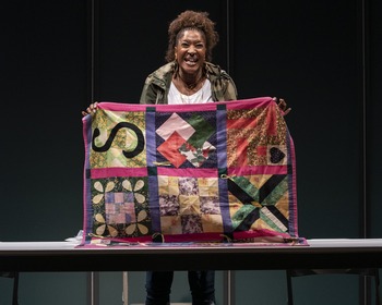 Peterson, who has taught poetry to incarcerated teenage boys at Rikers Island and later became the regular visitor of a boyfriend imprisoned for violating parole, wrote the one-woman play and embodies the character of Betsy LaQuanda Ross, whom the audience sees in a sequence of scenes as she visits her best friend in prison. Andrew Cissna has designed a blank space with a table and chairs, representing a prison visiting room, while Katherine Freer's projections bring Peterson's imagery to concrete life, supported by Lugman Brown's music and sound design. Through the course of the 90-minute play, well paced by director Talvin Wilks, the audience learns about Betsy's childhood as the daughter of a Black Panther and the collapse of her family after her father went to prison; her former boyfriend, now doing time and trying to get her back and the part-Native American, part-African American she's currently seeing (Peterson also embodies both men in brief speeches); her troubled teen years; and her mission to help the people she knows who have been caught up in the prison system. Betsy talks about how slavery is not a metaphor when referring to prison inmates: under the law, they can be forced to work for no or little pay. "We're straight cash money crops," she says, part of a system where the private companies that operate penal facilities have an incentive to incarcerate people, both for their direct financial benefit and as a source of employment in the communities where the prisons are located. Lest all this sound too grim, Peterson keeps the conversation lively. Betsy is a vegetarian who also loves fried chicken wings (as far as she's concerned, they don't count as meat); she tells an outrageous story of a tiny drug dealer who operates out of a baby carriage; she shares the neighborhood gossip; and she talks about the natural beauty of the countryside surrounding the prisons in upstate New York.