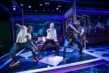 Chisholm borrows the idea of social transformation from George Bernard Shaw's Pygmalionand there's a scene that My Fair Lady fans will pick up on right awaybut he blends it with the tropes of reality television. His Eliza Doolittle is Dorian Belle (Simon Kiser), a white-bread pop singer from Toronto who wants to develop some street cred. He's placed under the tutelage of thoughtful Alexand Da Great (Gary L Perkins III) and excitable Blacky Blackerson (Seth Hill), a hip-hop duo known as P.Y.G. (Petty Young Goons), and the three of them share a glittering mansion as the cameras roll. The fascinating thing in Chisholm's vision is that the questions of cultural appropriation cut both ways. The rappers present themselves as products of the rough Chicago streets, but they actually grew up in the suburbs. They went into this television gig to cross over to white audiences, although that includes censoring their language (there's a nifty running gag involving a beeper) and getting pushback from African Americans who think they're selling out. On the other hand, they know their stuff, as they demonstrate while teaching Dorian about how different parts of the country have developed their own versions of hip-hop. Gabriel Clausen wrote the tunes for the performers' songs. The actors are all fully invested in their roles, helped by Danielle Preston's on-the-nose costumes: Kiser, naïve but determined, doe-eyed in a white blouse with ruffled cuffs and a bow at the neck; Perkins, serious with his cropped hair and baseball cap; and Hill, in a bright shirt and dreadlocks pulled into a crown on top of his head. But that isn't the only thing Chisholm wants to convey. He periodically interrupts the action with "commercials" for products that either maintain or challenge the status quo, such as "Whiteman Shoes," which allow the wearer to step on other people without even noticing, or two conflicting shortcuts to achieving social consciousness: "DeWoke Spray" and "Stay-Woke Spray." It sounds much heavier-handed than it actually is, supported by Kelly Colburn's projections on the video wall of Richard Ouellette's set.