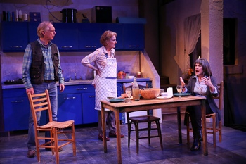 Hazel (Jeanne Paulsen) and her husband Robin (Richard Howard), retired nuclear physicists, are staying in their seaside cottage (designed with economy by Tom Kamm) following a disaster that has placed their house and farm within the "exclusion zone." After almost 40 years, their friend and former co-worker Rose (Naomi Jacobson) has appeared for reasons that don't become clear until well into the 90-minute play. Director David Muse keeps the pressure building subtly so that when the surprises come, they're genuine shocks. Kirkwood's language is both naturalistic and poetic, as when Hazel says a looming tsunami looked "like the sea was boiling milk" and sensing invisible nuclear radiation as "filthy glitter" in the air. The issue is the choices people make with the best intentions and the unexpected results that could threaten life for their descendants. (Sometimes the threats are more obvious than others: the playwright based her description of the disaster on the 2011 incident in Japan that caused a meltdown at the Fukushima Dai-ichi nuclear plant.) Paulsen and Howard are convincing as a comfortable, well-matched couple dealing with day-to-day life in the face of the unthinkableRobin goes into the exclusion zone each day to look after the farm; Hazel stays home and tries to keep herself together. Jacobson brings an underlying electric tension to her character, who is determined to make changes for the sake of the future. "You can't have everything you want when you want it," she says when Hazel laments the need to eat salads and bread instead of cooked meals because the catastrophe has led to limits on the hours when electricity is available. Miriam Nilofa Crowe's lighting design and the sound design by Broken Chord provide a baseline of anxiety, a nagging sense that makes the audience understand that facing the risks is less dangerous than ignoring them.