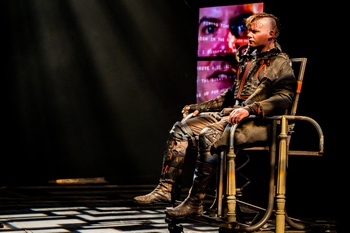 In this retelling, Richard (Alex Mills) is a gallant soldier, killing the previous king and giving the crown to his brother Edward (Philip Fletcher), but his battle injuries are so severe that he can only survive with the help of robotic technology. (The surgery is undertaken by two humanoid creatures, Tyrell (Ana Tsikurishvili) and Ratcliffe (Scean Aaron), who become Richard's servants.) This action saves his life but fractures his humanity. The idea is intriguing, but does it work theatrically? On a stage littered by twisted metal wreckage and periodically scrutinized with surveillance-like projections (both designed by Tennessee Dixon), this Richard tries on occasion to fit in with the people around him, but he can never overcome his isolation. This softens the character, making him at times "more sinned against than sinning" (to borrow a phrase from another of Shakespeare's plays). Mills is at his best when he's most physical, in a violent fury or ostentatiously framing someone else for a crime he committed. The physical production is striking throughout: battles fought by soldiers whose guns shoot green and red laser beams through stage fog (lighting design by Brian S. Allard); the corpse of the previous king in a glass coffin; the vivid despair of Lady Anne (Maryam Najafzada), whom Richard is determined to marry; and the ultimate appearance of soldiers wearing black armor that makes them resemble insects (costume design by Erik Teague). The company's resident composer, Konstantine Lortkipanidze, has created an eerie electronic score, which reverberates through Thomas Sowers' sound design. Richard III is the 14th in Synetic's series of "Wordless Shakespeare" productions, although this one isn't completely wordless: pieces of the text can be heard in voice-over and seen on scrolling screens. The action, although simplified by Nathan Weinberger, is still complex enough to need that support.