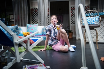 Studio Theatre is hosting a visit of the Off-Broadway production of the play through July 28 as part of its first Showroom series, a summertime collection of limited-run performances in the second-floor Milton Theatre. Jeff Hiller, who succeeded the playwright in that run, is playing the role at Studio under the purposefully frenetic direction of Michael Urie. The premise is that Gerry has driven to Palm Springs for the wedding of Josh, a friend, and Brennan, a younger man who is so boring that Gerry compares him to an ottoman. (And don't get him started on Brennan's family.) He arrives to discover that he's sharing a guest house with Duane, a former roommate and lover, and his new partner, 23-year-old architecture student Mac. Hiller plays Gerry at maximum volume throughout the 80-minute performance: his hyperactive pacing around Dara Wishingrad's scenic design of rattan furniture and vivid accents like feather-trimmed hot pink lampshades; his flouncing walk; the way he whines as he tosses around cultural references that go right over Mac's head. "We're gay. We celebrate things while we make fun of them," he says. Gerry's major gripe is that the wedding invitation asked guests not to wear "bright colors or bold patterns" and, since he arrived wearing a loud Hawaiian shirt and mauve shorts, he takes that as a personal insult. (Where does khaki fit on the rainbow, he asks rhetorically.) Much alcohol is consumed, much cocaine is snorted, and Gerry says a lot of things he should not have said before finally getting real. Part of Droege's messagebesides the fact that Gerry is treating his life like a piece of performance art and the people around him as propsincludes the changes the character has seen in the gay experience over the decades. When, he wonders, did gay men decide they wanted to fit in rather than be fabulous? When did flamboyance stop being a goal in itself? The audience becomes part of Gerry's world by sitting in curving rows of chairs or at small tables that surround the stage, with easy access to a bar in the back of the theater.
