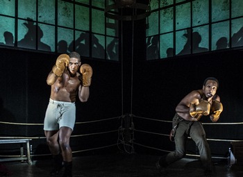 Ramirez started out with the story of Jack Johnson, the first African-American heavyweight boxing champion, and his 1910 defeat of the previous white champion (whom white boxing fans called "The Great White Hope"), but he fictionalizes the characters and events to make a more general point about the backlash that often follows such a public, defiant action. To emphasize the sports-as-life metaphor, scenic designer Debra Kim Sivigny has configured the black box theater as a boxing ring, with seating on two sides. The five actors, a tight ensemble, bring the audience into the action by standing among them at times and inviting their participation. Jay "Sport" Jackson (Jaysen Wright) is cocky because he knows he's good. He needles a challenger (Clayton Pelham Jr.), then after the fight praises him for his skill. He has an easy friendship with his trainer Wynton (Jay Frisby) and a cordial relationship with his white promoter Max (Chris Genebach), but he's most concerned about taking on the retired white champion to prove his legitimacy. He only begins thinking about the bigger picturewhite men wanting to kill him and attacking African-American fans who admire him too vociferouslyafter a visit from a woman he knew years earlier (Lolita Marie). Much of the 90-minute play consists of stylized boxing bouts, staged by Hernandez and Williams (supported by Kenny Neal's sound design) without actual physical contact. One boxer throws a punch, the other reels back, but they're fighting side by side instead of facing each other. More than an arresting stage effect, it brings the audience into the heads of the combatants. Sarah Tundermann's lighting design, including period fixtures, and Kelly Colburn's projections add perspective. This production is a partnership between Olney Theatre Center and 1st Stage in Tysons Corner, Virginia, where it will be restaged early next year.