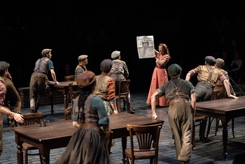 The musical by Alan Menken (music), Jack Feldman (lyrics), and Harvey Fierstein (book), adapted from a 1992 Disney movie, recounts a true story of poor newsboysand, in this production, a few newsgirlsin 1899 New York City, taking on the unfair tactics of newspaper titan Joseph Pulitzer (Edward Gero). Smith finds a parallel between the newsies of more than a century ago and contemporary activism by young people on gun violence, climate change, and other issues, but she is never heavy-handed about it. Fierstein's solidly plotted book focuses on Jack Kelly (Daniel J. Maldonado), the leader of the newsies and the one who holds them together in both good and bad times. As Ken MacDonald's ever-shifting scenic designwhich at times includes the aisles and the walkway behind the seating areasdemonstrates, many of the newsies are homeless, sleeping on tenement roofs and fed by kindly nuns and tavern owners; a few have left school to support their families because a parent is unable to work; and some end up in a Dickensian for-profit youth prison (another subject with modern parallels). Maldonado has the necessary swagger and powerful voice, and is well-matched by the actresses playing two women who help Jack along the way. The redoubtable Nova Y. Payton, in Alejo Vietti's most glittery costumes, is Medda Larkin, vaudeville star and theater owner, and Erin Weaver, recipient of six solo Helen Hayes Awards and one ensemble award, is Katherine Plumber, a young woman fighting the odds to become a journalist in a male-dominated field. While Pulitzer is undeniably the heavy in this story, well-respected Washington actor Gero gives him a gloss of self-justification: he really believes that, if he's going to boost his profits, gouging the kids at the bottom will teach them a valuable lesson. (Of course, the lesson they learn is somewhat different.) But back to Esse's choreography. The newsies fly through the air with cartwheels, somersaults, leapfrog, stage-filling acrobatics, a bit of an Irish jig, even a tap routine on tabletops, and never seem winded.