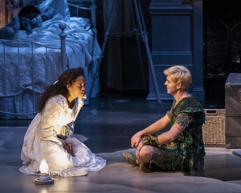 Director Alan Paul and his bountifully talented cast have created a lavish production for both the eyes and ears, from Jason Sherwood's enveloping sets and Isabella Byrd's often otherworldly lighting design to Loren Shaw's costumes, Jared Mezzocchi's projections, James Ortiz's puppet design, Jenny Giering's score, and John Gromada's sound design. Gunderson sets the play in London in 1903, shortly after Marie Curie received the first of her two Nobel Prizes. Wendy Darling (Sinclair Daniel) has a restless mind and a fierce intelligence; while her well-meaning mother (Jenni Barber) wants to send her to finishing school to learn proper domestic arts, Wendy would rather study astronomy. When Peter Pan (Justin Mark) appears at the window, trying to reclaim his lost shadow (an ingenious bit of, yes, shadow puppetry), Wendy eagerly wants to learn more about him and his friend Tinkerbell, a ball of light that Wendy mistakes for an errant star. Soon, Wendy and her younger brothers John (Christopher Flaim) and Michael (Chauncey Chestnut) are joining Peter in the skies between London and Neverland. Paul Rubin has choreographed the flying sequences to fit seamlessly in the narrative, just another wonder in a stage full of them. Gunderson also has reimagined Tiger Lily (Isabella Star LaBlanc) as the last remaining indigenous resident of Neverland rather than a cartoonish "savage." Like Wendy, she knows her own mind; she has no patience with the invaders who appropriated the land of her people, whether that means Peter or the foppish, image-obsessed Captain Hook (the deliciously hammy Derek Smith). Also, like Wendy, she understands that Peter's refusal to grow up has its negative aspects. Other standouts in the large, accomplished cast include Tom Story, hilariously obsequious as Hook's sidekick Smee, and Barber, who also embodies Tinkerbell in Neverland with a serious attitude and a costume that suggests an Edwardian chorus girl. And then there's the casting of Nana, the dog serving as nanny to the Darling children, who earns "Aw"s with every entrance.