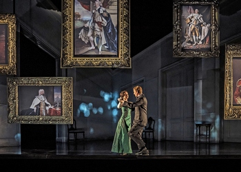 Playwright David Seidler, who won an Oscar for the screenplay, takes audiences back to the 1930s, when the British royal family was facing both internal and external challenges. King George V (John Judd) worries because his heir David (Jeff Parker) is in love with, and wishes to marry, a twice-divorced American socialite, Wallis Simpson (Tiffany Scott)not appropriate behavior for the man who would lead the Church of England. It's giving nothing away to say that David assumed the throne as Edward VIII upon his father's death, then abdicated rather than give up the woman he loved. At the same time, the United Kingdom is watching Adolf Hitler's domination of Germany and likely future threat to England. (Dialogue makes clear that Edward and Wallis have no problem with the Nazis.) The concern is whether the next in successionDavid's brother Albert, or Bertie (Nick Westrate)would be up to the stresses of reigning. He's resolute enough and understands the issues, but since childhood he has had a debilitating stutter. Since radio has made it possible for a monarch to address his people directly, can Bertie, literally, have a voice in the international conversation? Elizabeth (Maggie Lacey), Bertie's devoted wife, finds Lionel Logue (Michael Bakkensen), a speech therapist who works to ease Bertie's unease, and the play follows the growing bond between the flamboyant Logue and the painfully reserved prince, and its larger implications. Westrate is charming and heroic, well matched with Lacey. Bakkensen gets to show off more: Logue is a frustrated Shakespearean actor, and his interplay with his wife (Elizabeth Ledo) is a highlight. Parker ably shows both David's abundant charm and his sense of entitlement. Director Michael Wilson skillfully plays up the various conflicts: among George V, who understands that the royal family is a corporation with specific responsibilities to the people it serves, and his sons, one selfish ("What's the point of being king if you can't have your own way?" David asks) and one painfully shy; between the two brothers; between Bertie and Logue, whose unorthodox speech exercises add to the prince's discomfort; and among the politicians, archbishops, and other leaders with their own opinions. The drama takes place on Kevin Depinet's simple but eye-catching set: a foreshortened room with large doors on each side, a gallery of royal portraits. Howell Binkley's lighting design occasionally turns expressionistic, using deep colors to echo Bertie's moods, while David C. Woolard has created appropriately sumptuous costumes. The King's Speech runs through February 16, 2020, at The National Theatre, 1321 Pennsylvania Ave. NW, Washington DC. For tickets and information, please call 1-800-447-7400 or visit www.thenationaldc.com or www.telecharge.com. For more information on the tour, visit www.thekingsspeechtour.com/. By David Seidler Cast: