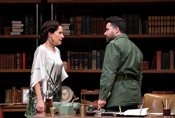 Andhy Mendez plays Fidel as broadly confident but willing and eager to listen to Celia (Marian Licha), a founder of the revolutionary effort and the only person whose criticism he accepts with only minimal complaint. She is sleek, educated, and as sure of her opinions as he is of his. Director Molly Smith's stylish production brings Fidel and Celia together with Consuela (Heather Velazquez), Fidel's young and ambitious aide, and Manolo Ruiz (Liam Torres), a former comrade of Fidel who fled to Miami after the Cuban Revolution. As they banter, argue, and try to forge policy and avert catastrophe (and bad press), they often speak in aphorisms. "Sometimes everything you want kills you," Celia says of Fidel's cigar habit, and Fidel describes being torn between advocating for the Third World and getting dragged into the First World. While Machado is writing fiction extrapolated from historic events, his literate script touches on numerous topics, including Cuban fighters in Angola supporting a Soviet-backed government, the status of the Bacardi rum brand after the factory owners fled Cuba, and gossip about Richard Nixoneven a touch of magic realism. Fidel speaks about how much he loves "his children," but Celia points out how he doesn't want his followers to think for themselves. Riccardo Hernández has designed a comfortable set that provides Fidel and those around him with an optimal platform to share their views. Packed floor-to-ceiling bookshelves, a well-stocked bar, a humidor, even a phonographit provides all the civilized comforts in a single space. Arena Stage has suspended performances of Celia and Fidel because of the Coronavirus and will resume them no earlier than March 30, 2020, in the Arlene and Robert Kogod Cradle, Mead Center for American Theater, 1101 6th St. SW, Washington DC. For tickets and information, please call 202-488-3300 or visit www.arenastage.org. By Eduardo Machado Cast: |