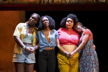 Lawrence E. Moten III has created an ingenious, non-literal scenic design that depicts the changing landscape with easily identifiable objects–road construction signs, advertising logos, references to lodging–and a two-lane road that climbs from the stage floor to the rear wall, the whole thing topped off with a skewed proscenium arch and illuminated by Amith Chandrashaker's neon-splashed lighting design. The rear half of a yellow car, and a New York State license plate on a yellow piece of luggage, represent the travelers' vehicle. June (Erin Margaret Pettigrew) came up with the idea for the trip, and she is the one who keeps referring to it as a journey. She has a definite issue in mind, which the audience learns long before the other travelers: Frankie (Cristina Pitter), tough and voluble; Rain (Afua Busia), mourning the end of a romance; and Willie (Dezi Bing), a transwoman dealing with people who insist on misgendering her. Their five-day odyssey, laid out on a map in the program, includes stops at offbeat tourist attractions and allows one of the women, a lifelong New Yorker, to learn to drive. What, then, is the play about? Simpson wants to show the unique perspectives and attitudes of Black women when they are alone together, just the four of them. (The play includes no interactions between them and the people they might meet along the way.) They share amusing and harrowing stories from their lives, primarily June, who hypnotizes the audience with her aria-like speech after they arrive at their goal. Ivania Stack's costumes exemplify how there is no single type of Black woman; each character dresses in a specific way, from Pettigrew's Whitney Houston T-shirt to Pitter's cropped jacket. it's not a trip it's a journey runs through May 8, 2022, in rep with "We Declare You a TerroristÂ…", at Round House Theatre, 4545 East-West Highway, Bethesda MD. For tickets and information, please call 240-644-1100 or visit www.roundhousetheatre.org. By Charly Evon Simpson Cast: |